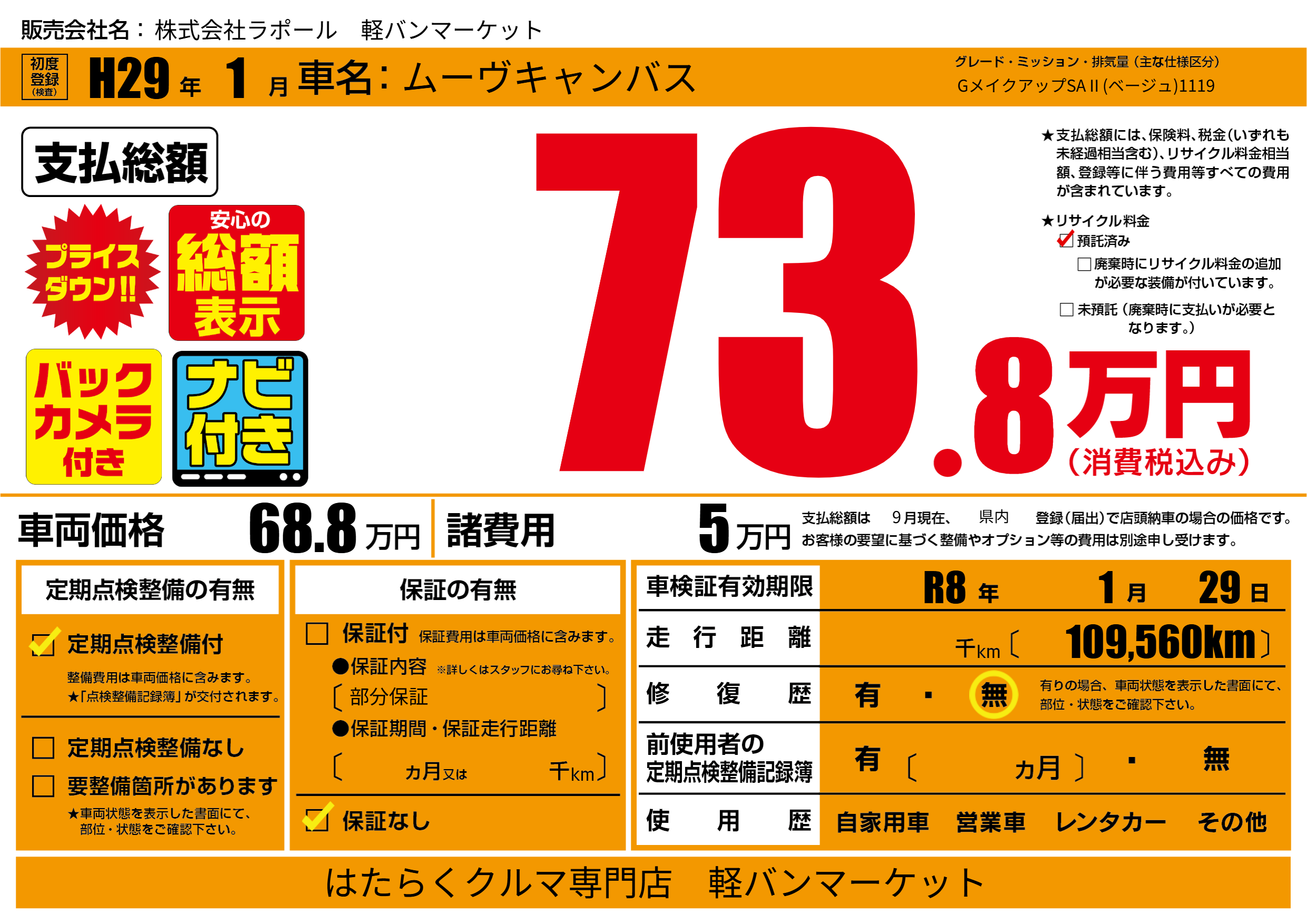 | 車名 | ムーヴキャンバス | グレード ミッション 排気量 |