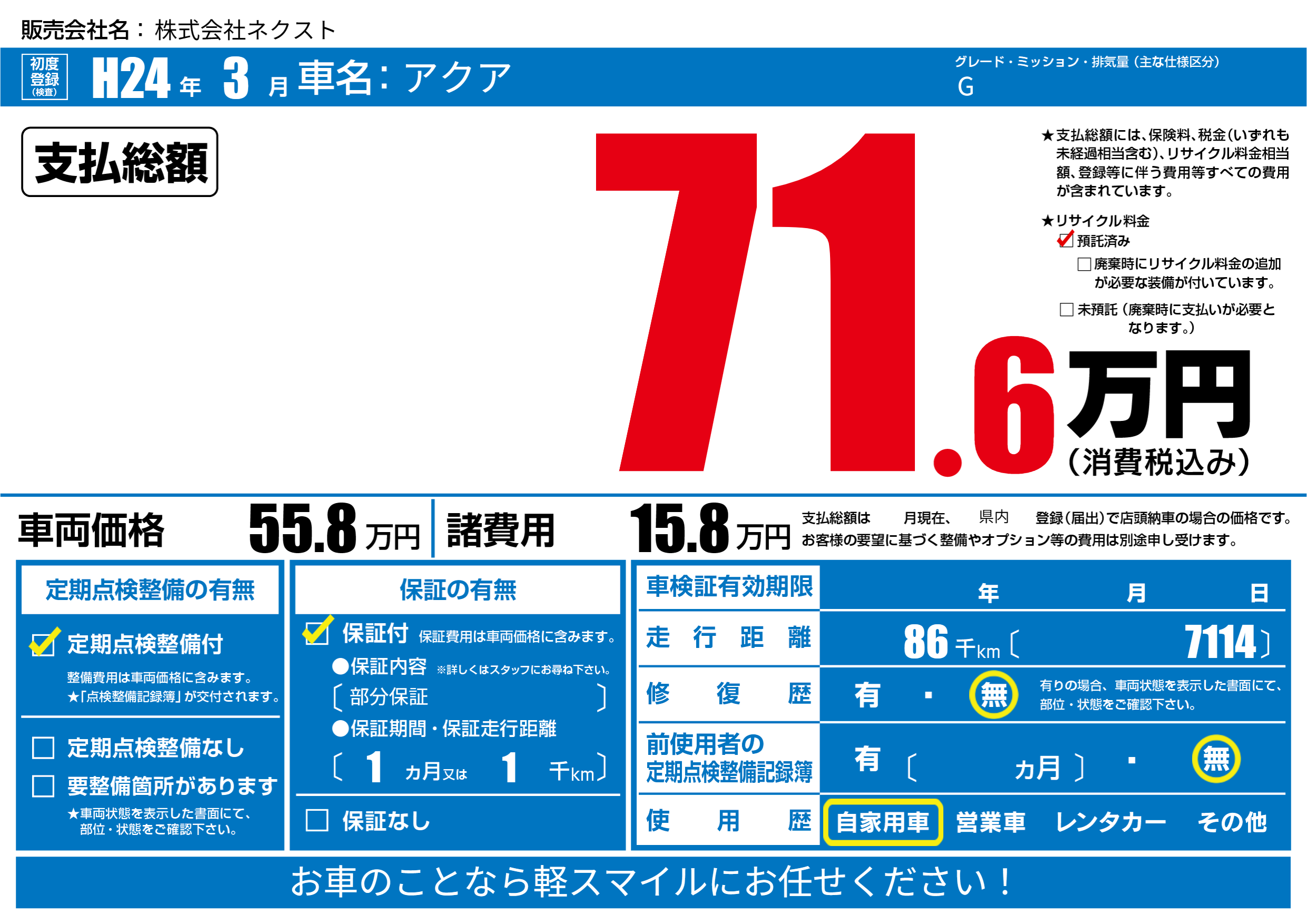 | 走行キロ | 8.6万km | 初年度登録 | H24年3月 |