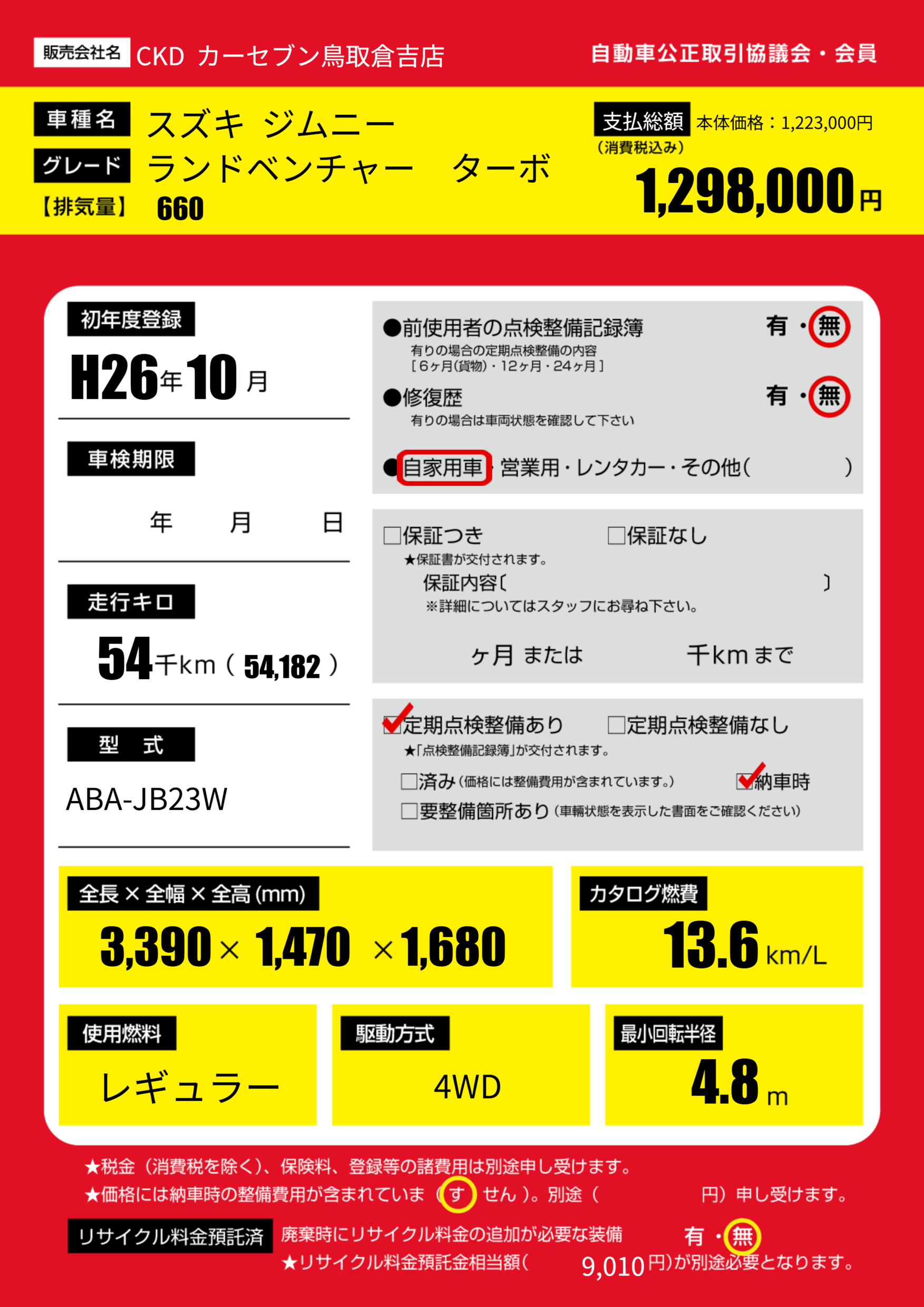 | 車名 | スズキ ジムニー | グレード ミッション 排気量 |