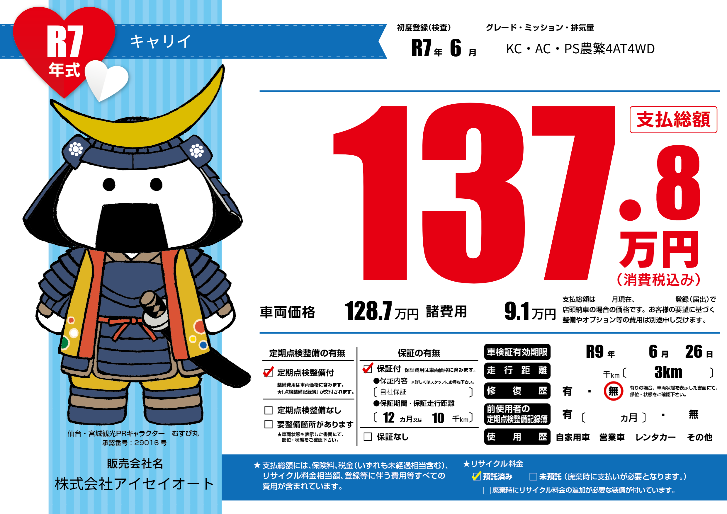 なし | 車検制限 | R9年6月26月 |