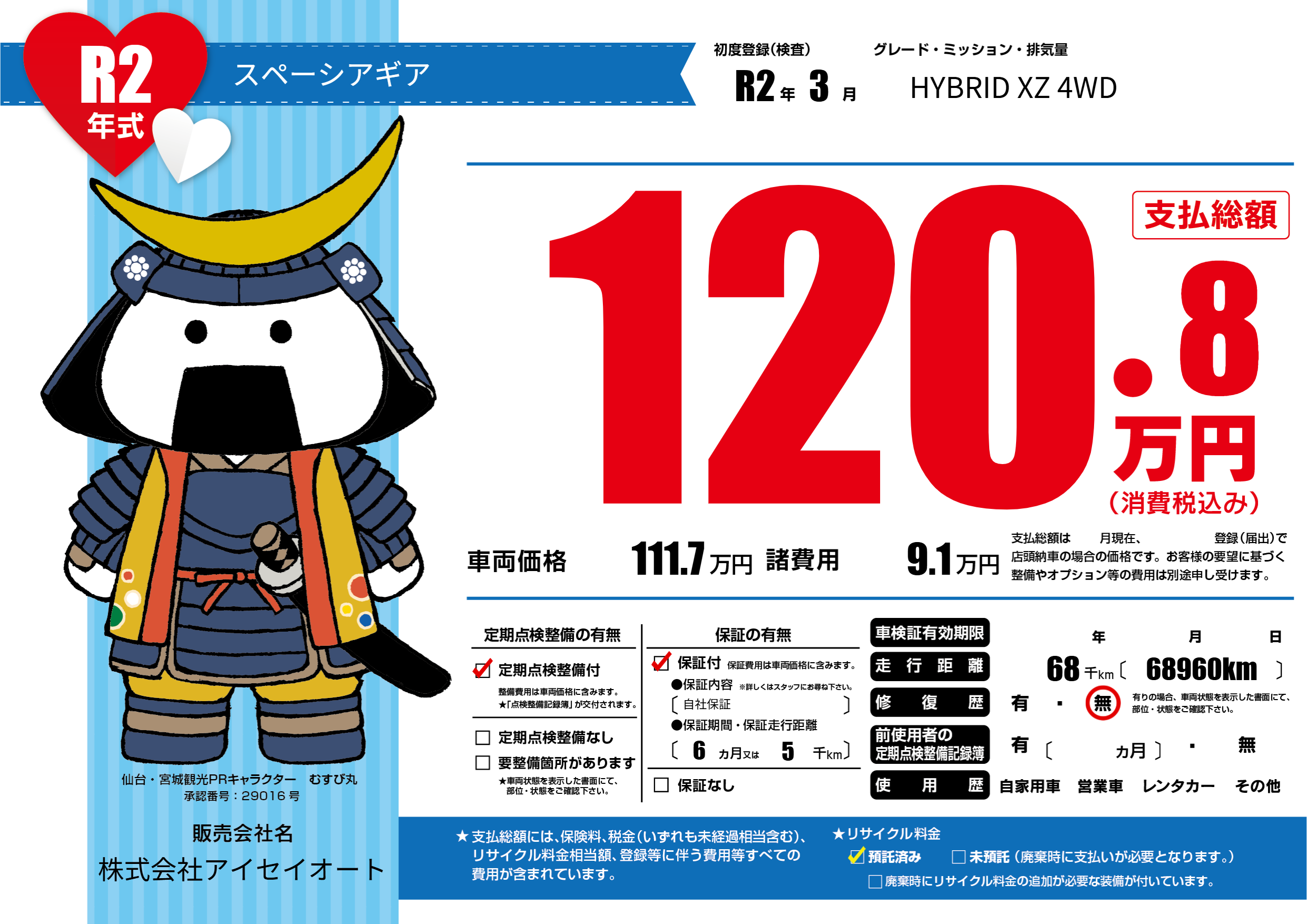| 走行キロ | 6.8万km | 初年度登録 | R2年3月 |