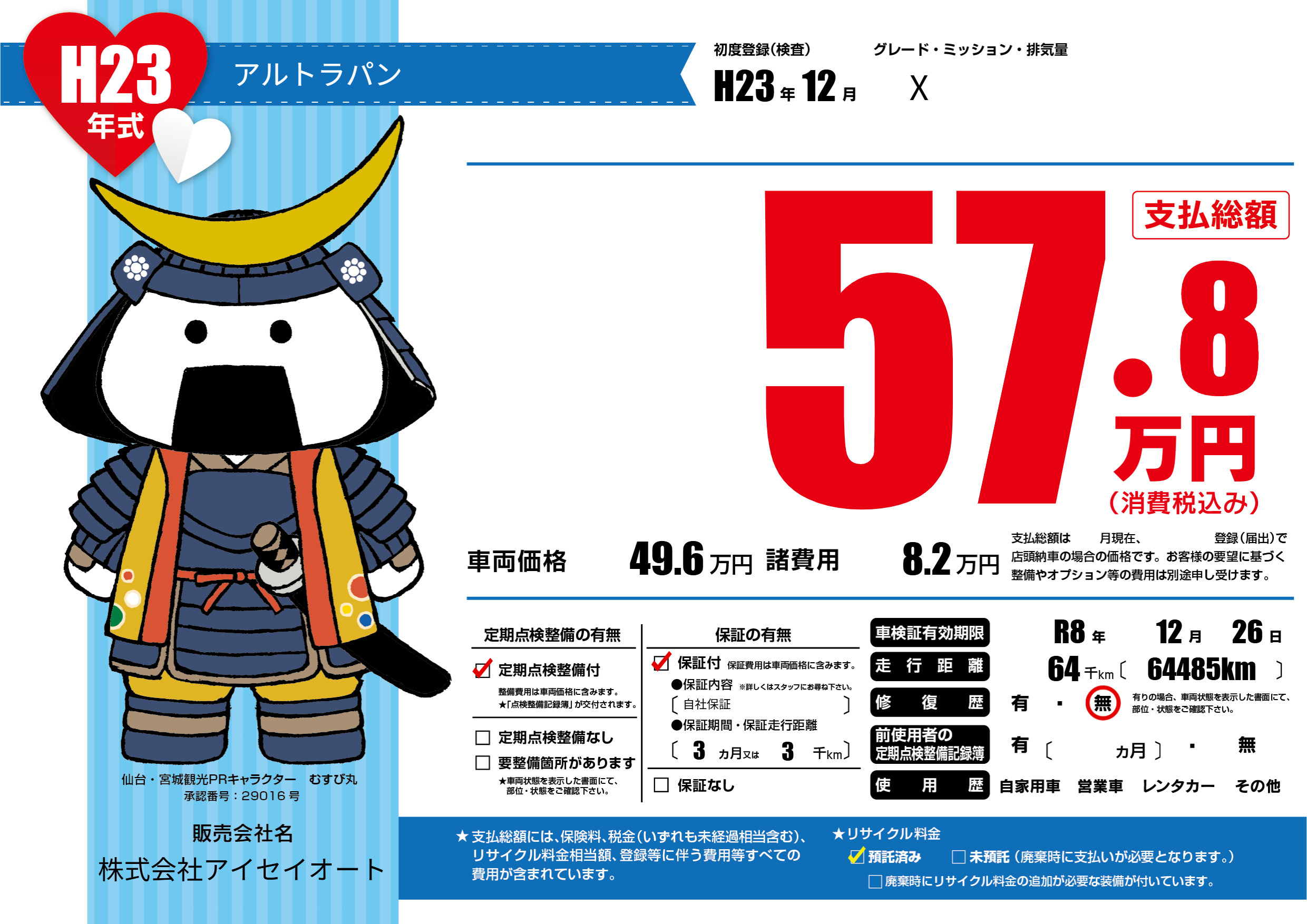 | 走行キロ | 6.4万km | 初年度登録 | H23年12月 |