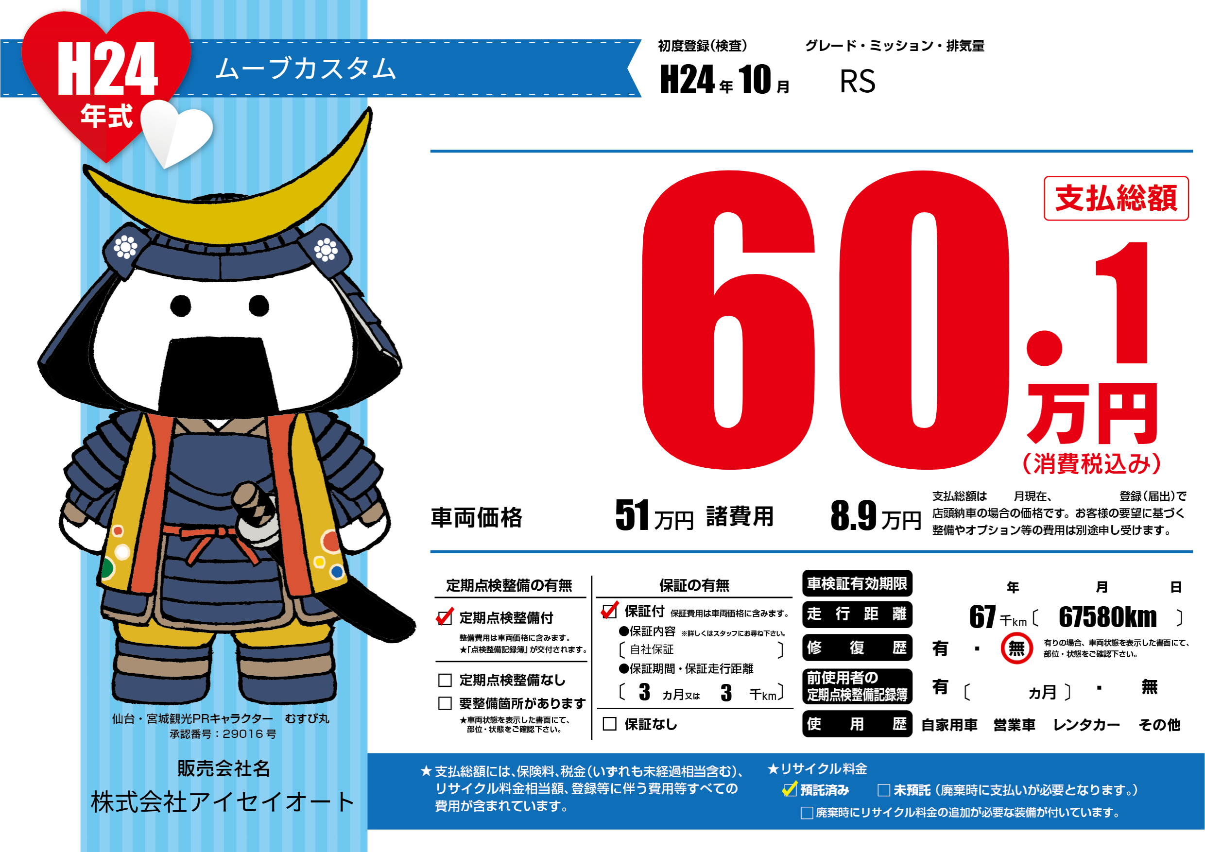 | 車名 | ムーブカスタム | グレード ミッション 排気量 |