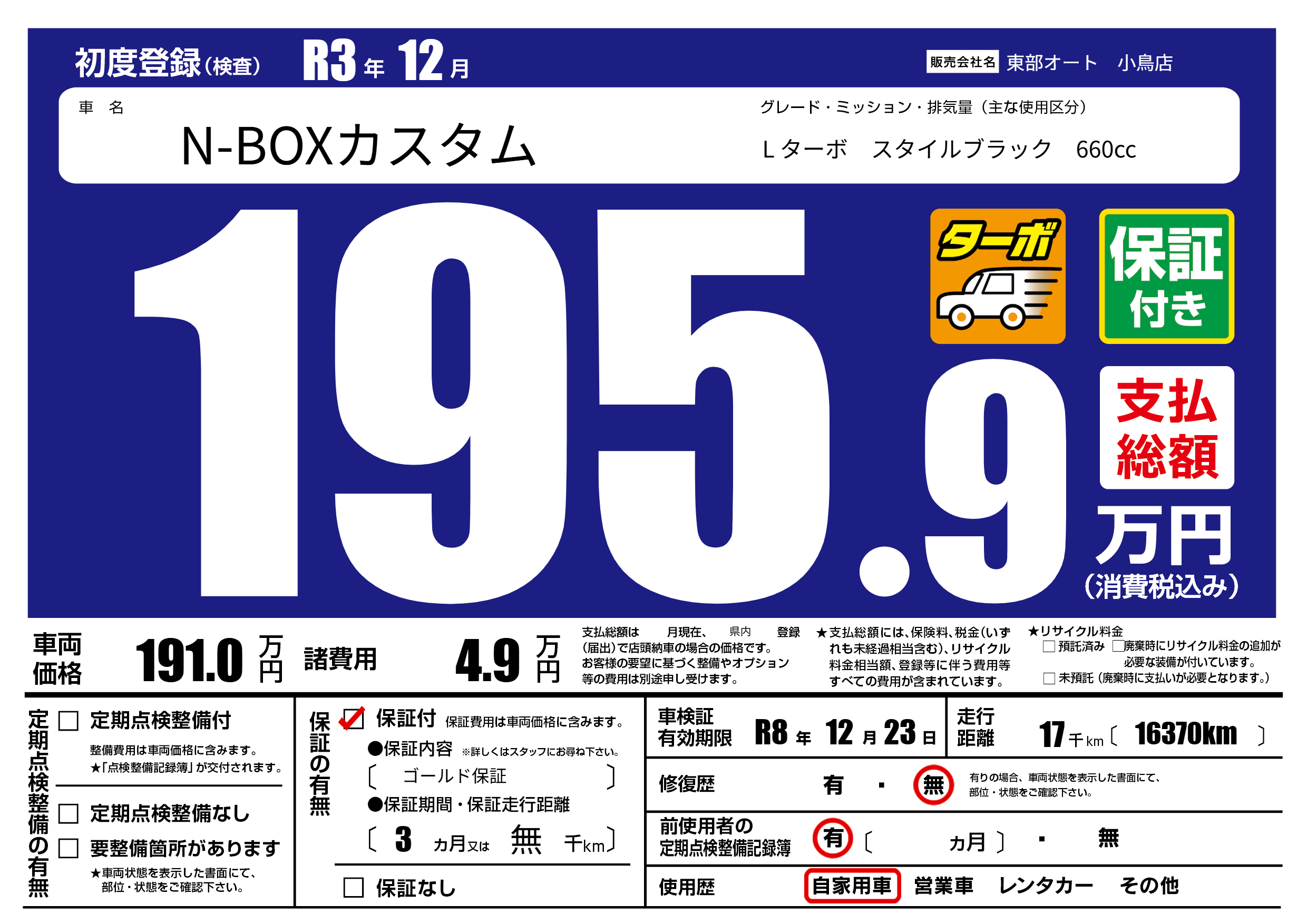 | 車名 | N-BOXカスタム | グレード ミッション 排気量 |