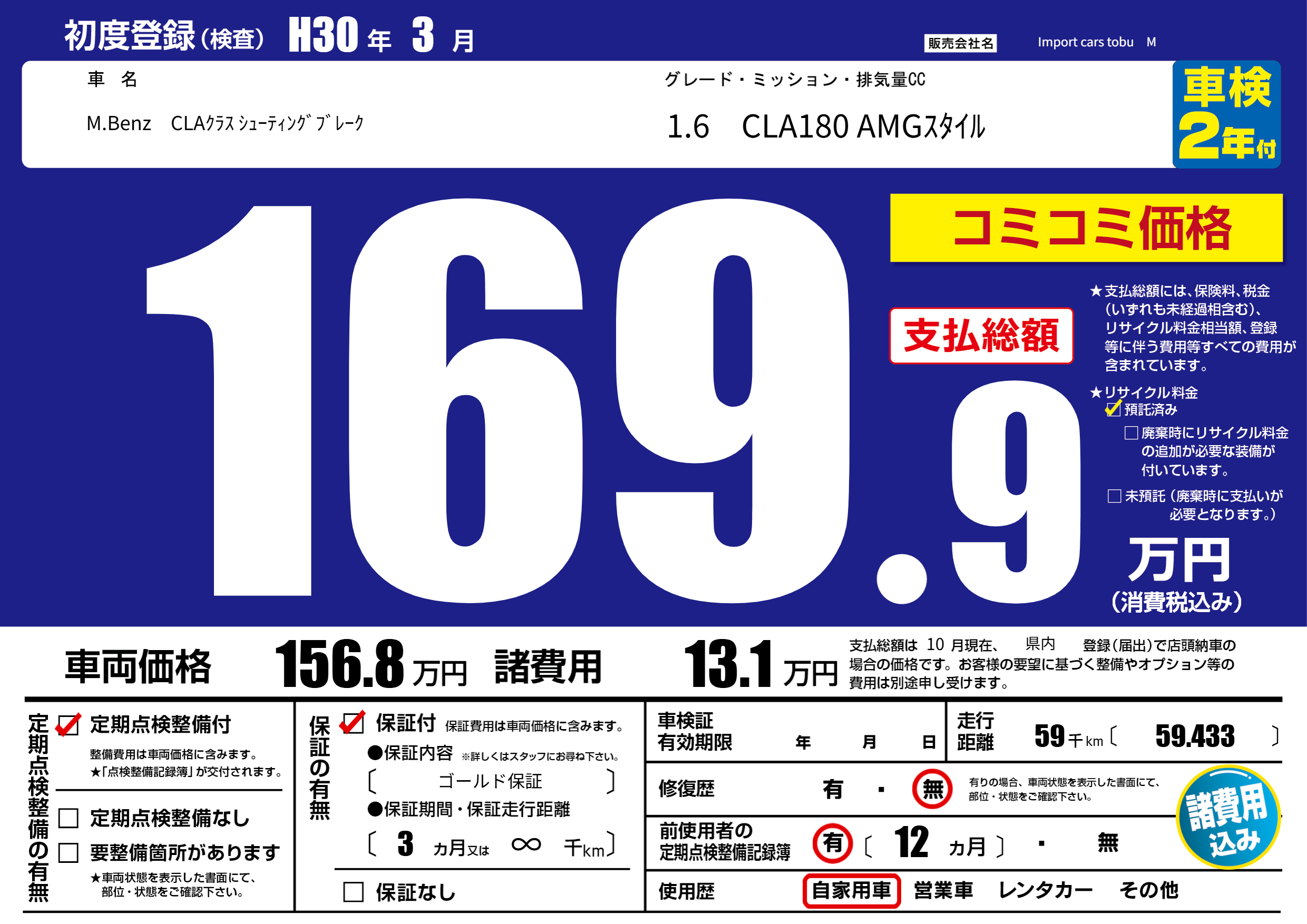 | 車名 | M.Benz CLAクラス シューティングブレーク | グレード ミッション 排気量 |