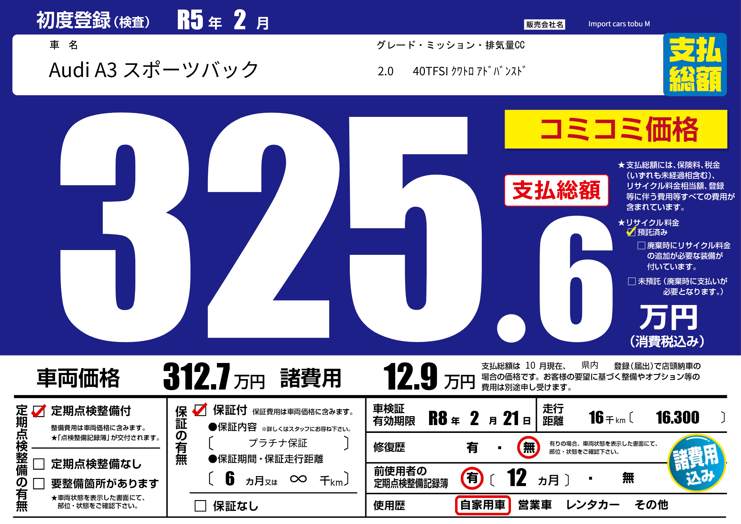 | 車名 | Audi A3 スポーツバック | グレード ミッション 排気量 |