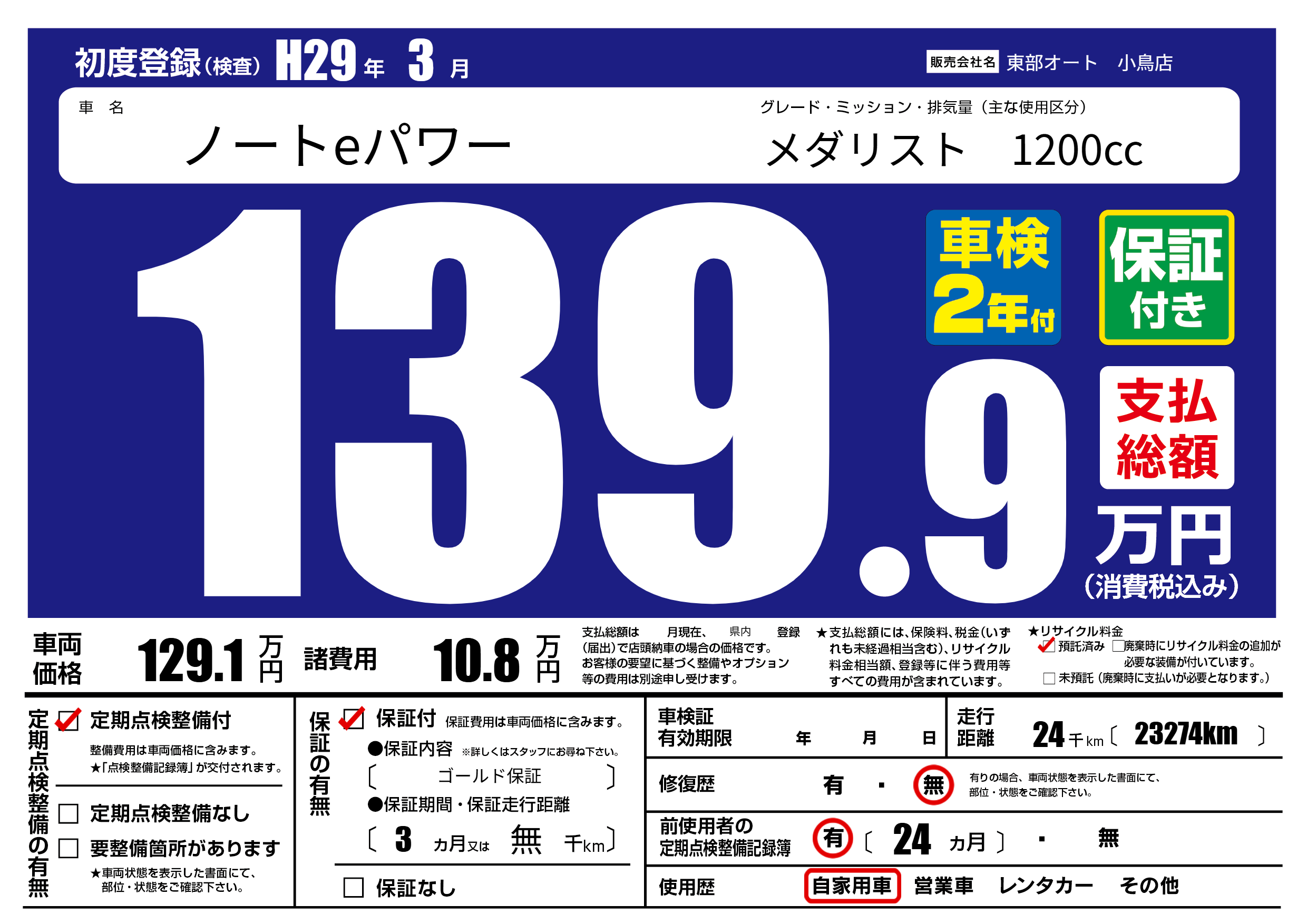 | 車名 | ノートeパワー | グレード ミッション 排気量 |