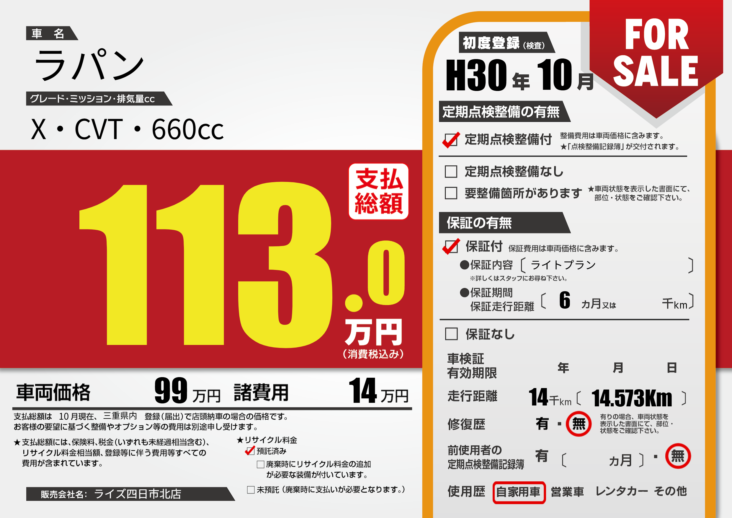 | 車名 | ラパン | グレード ミッション 排気量 |