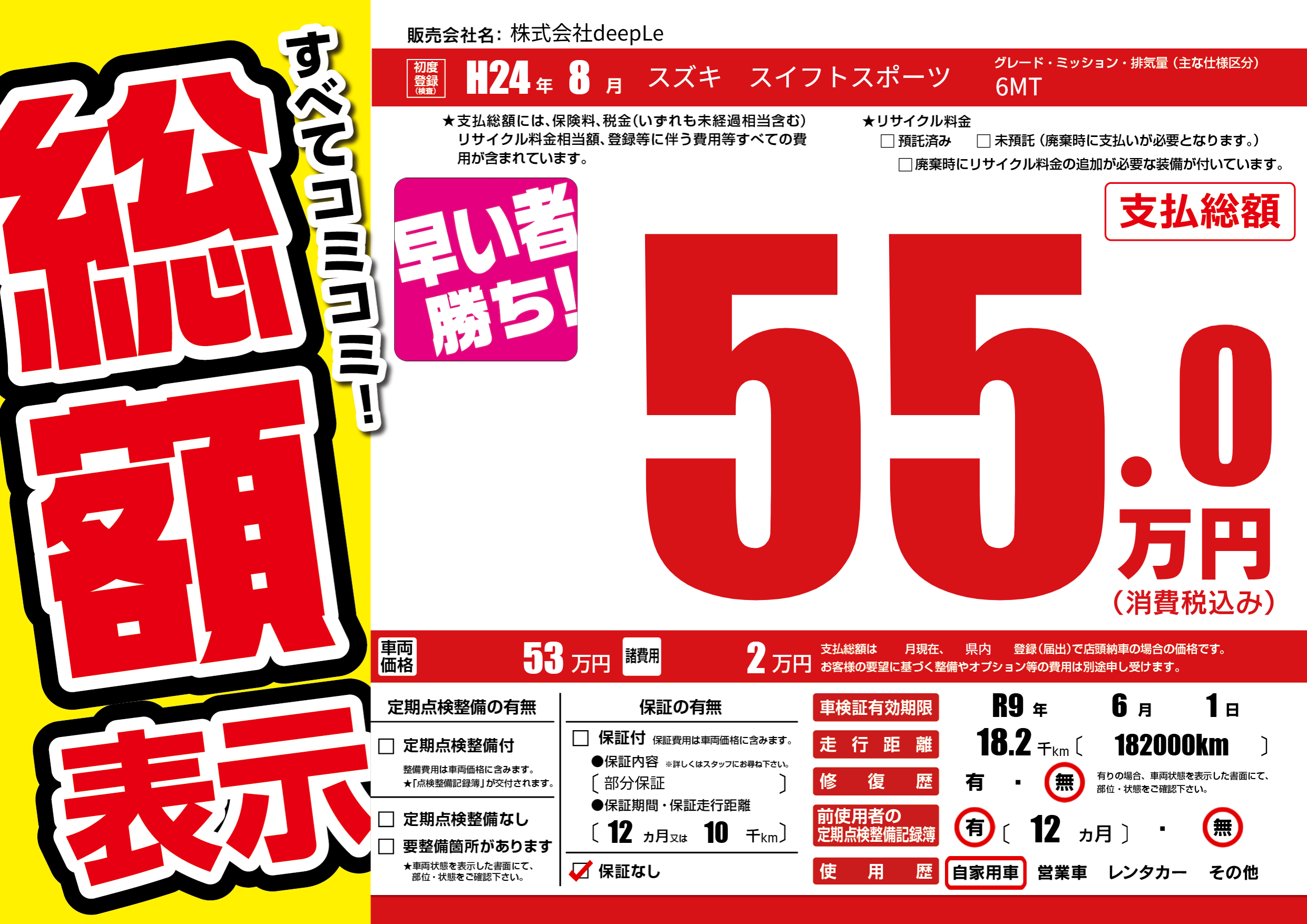 | 車名 | スズキ スイフトスポーツ | グレード ミッション 排気量 |