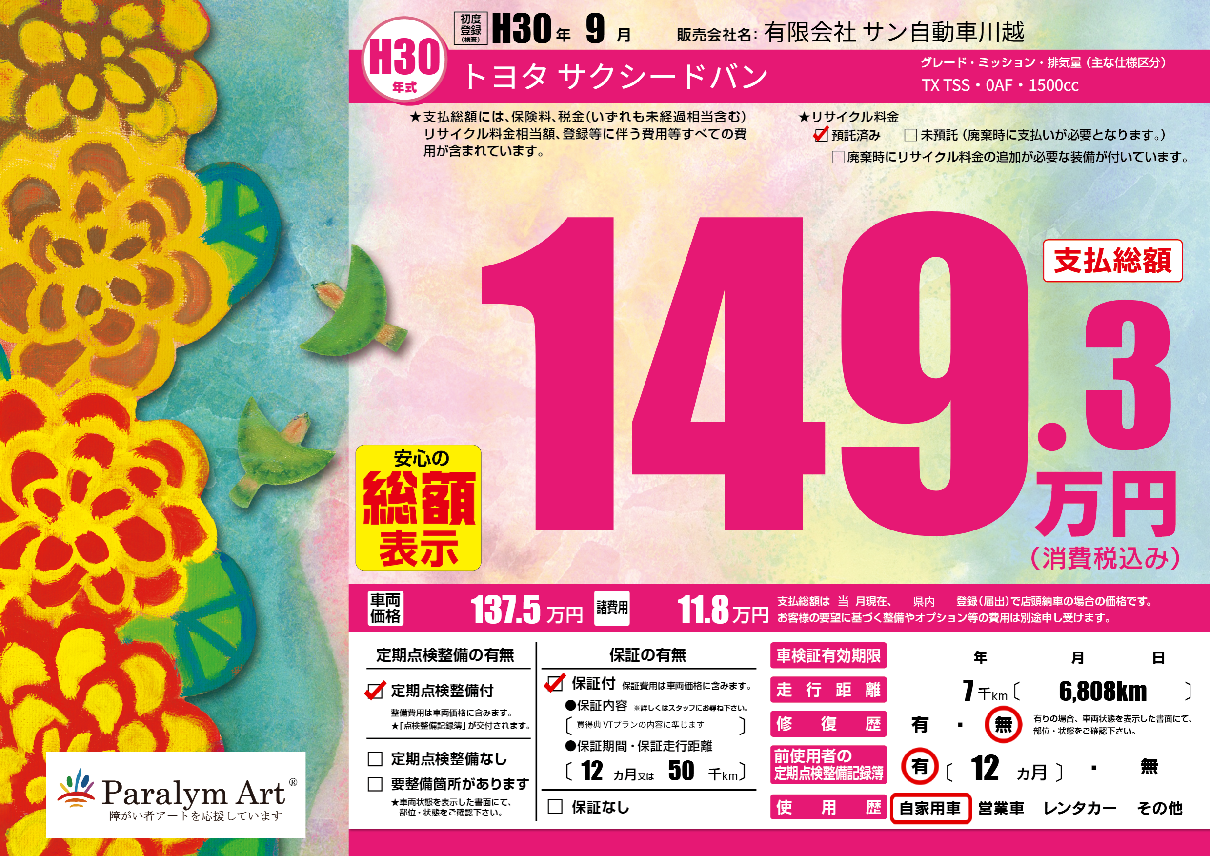 保証付き 保証内容(買得典 VTプランの内容に準じます) 12ヶ月または(50)千kmまで |