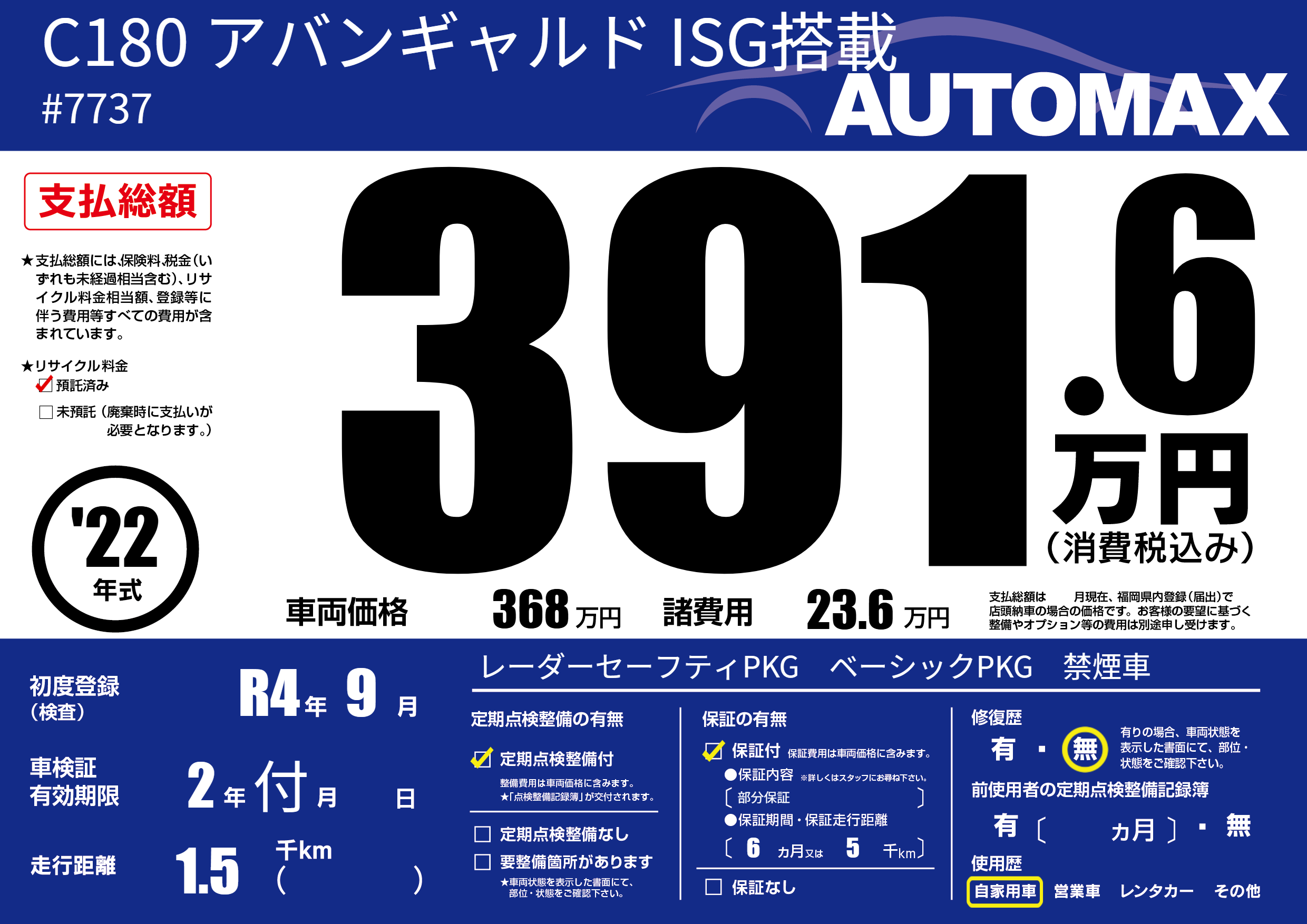 | 車名 | C180 アバンギャルド ISG搭載 | グレード ミッション 排気量 |