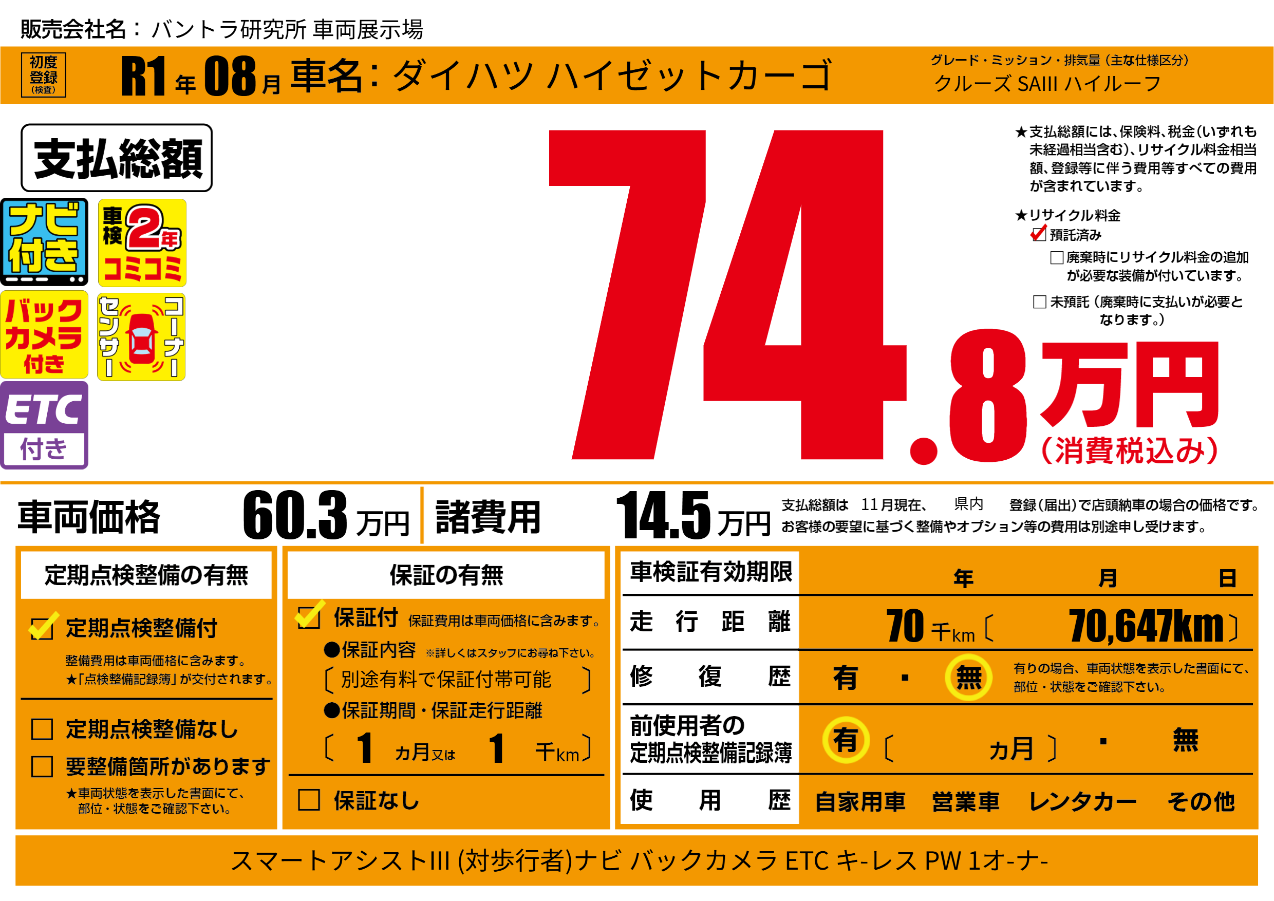 | 走行キロ | 7万km | 初年度登録 | R1年08月 |