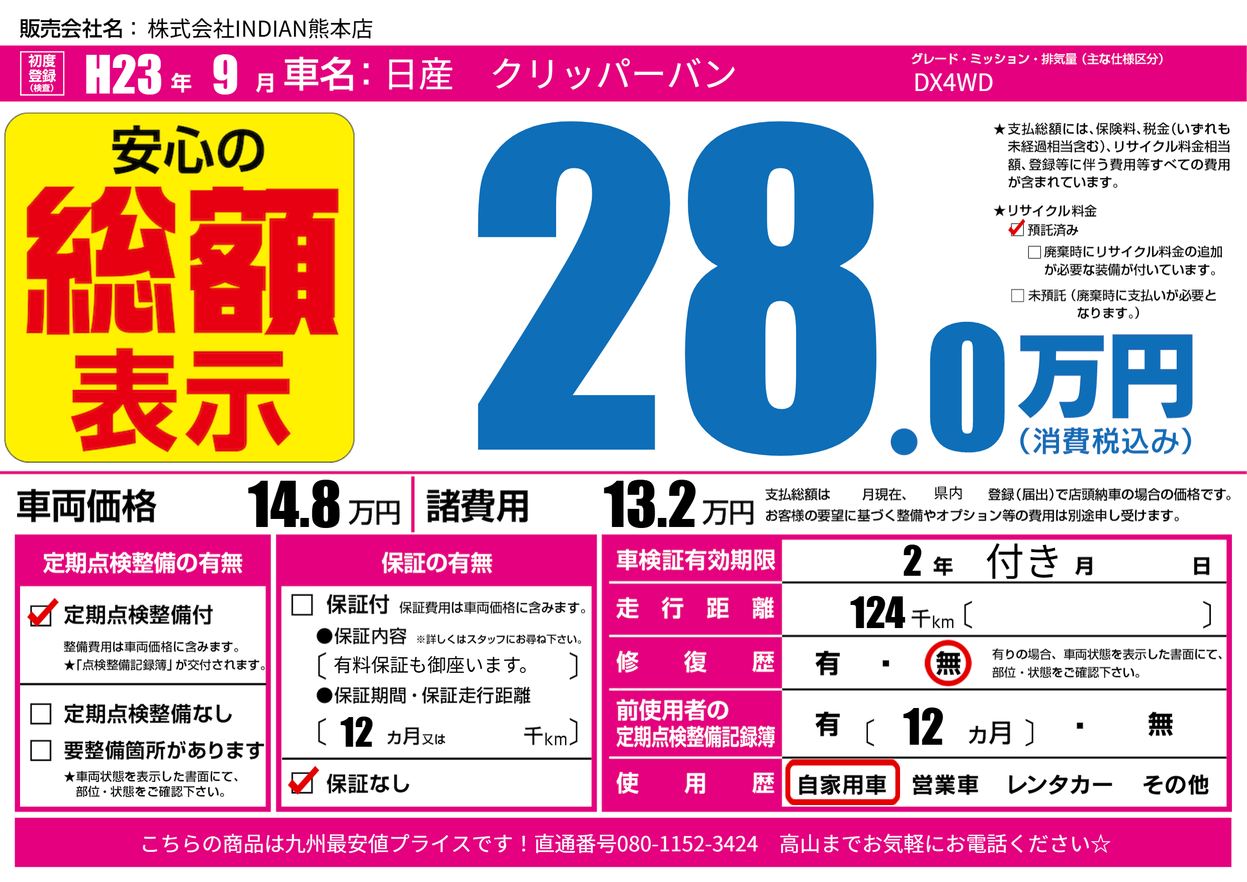 | 走行キロ | 12.4万km | 初年度登録 | H23年9月 |