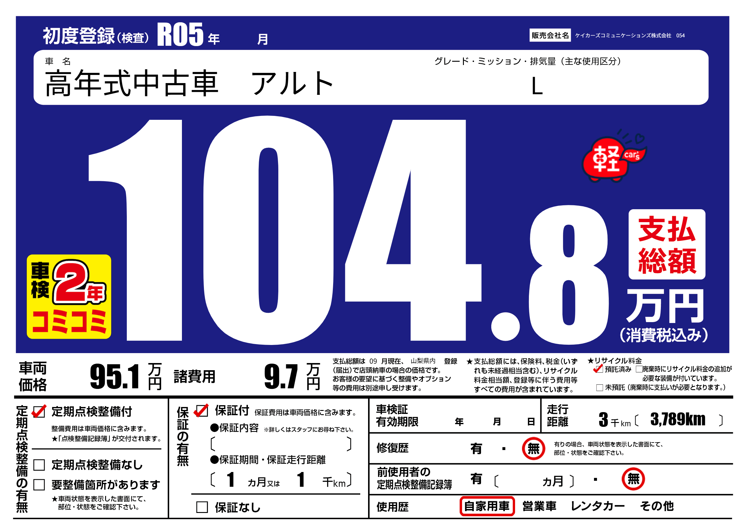 | 車名 | 高年式中古車 アルト | グレード ミッション 排気量 |