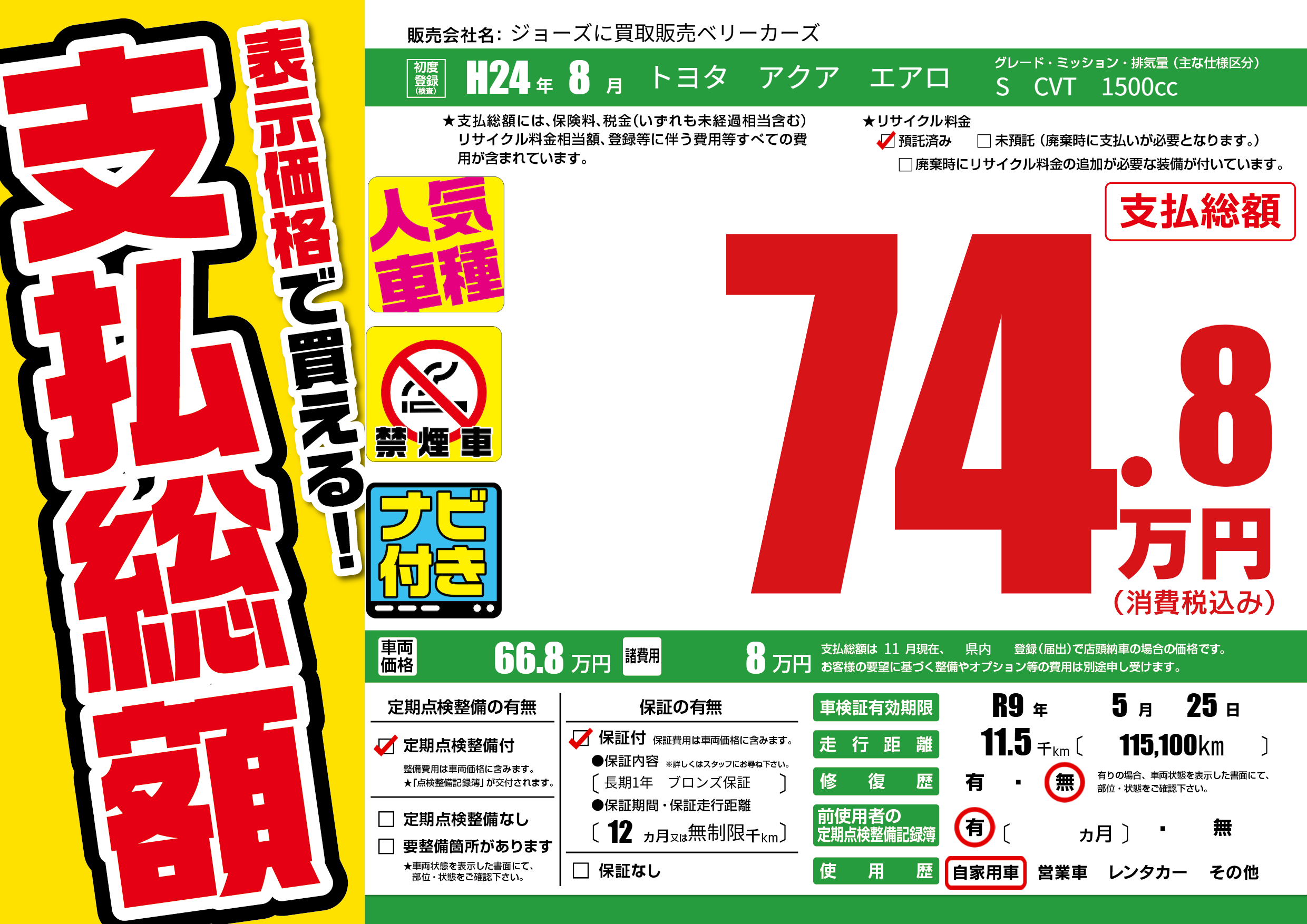 | 走行キロ | 1.1万km | 初年度登録 | H24年8月 |