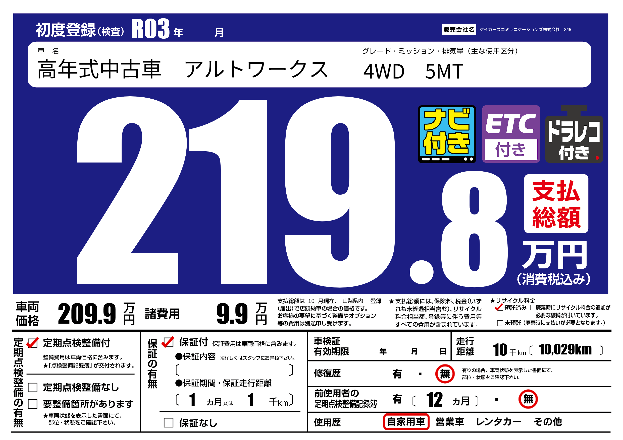 | 走行キロ | 1万km | 初年度登録 | R03年---月 |