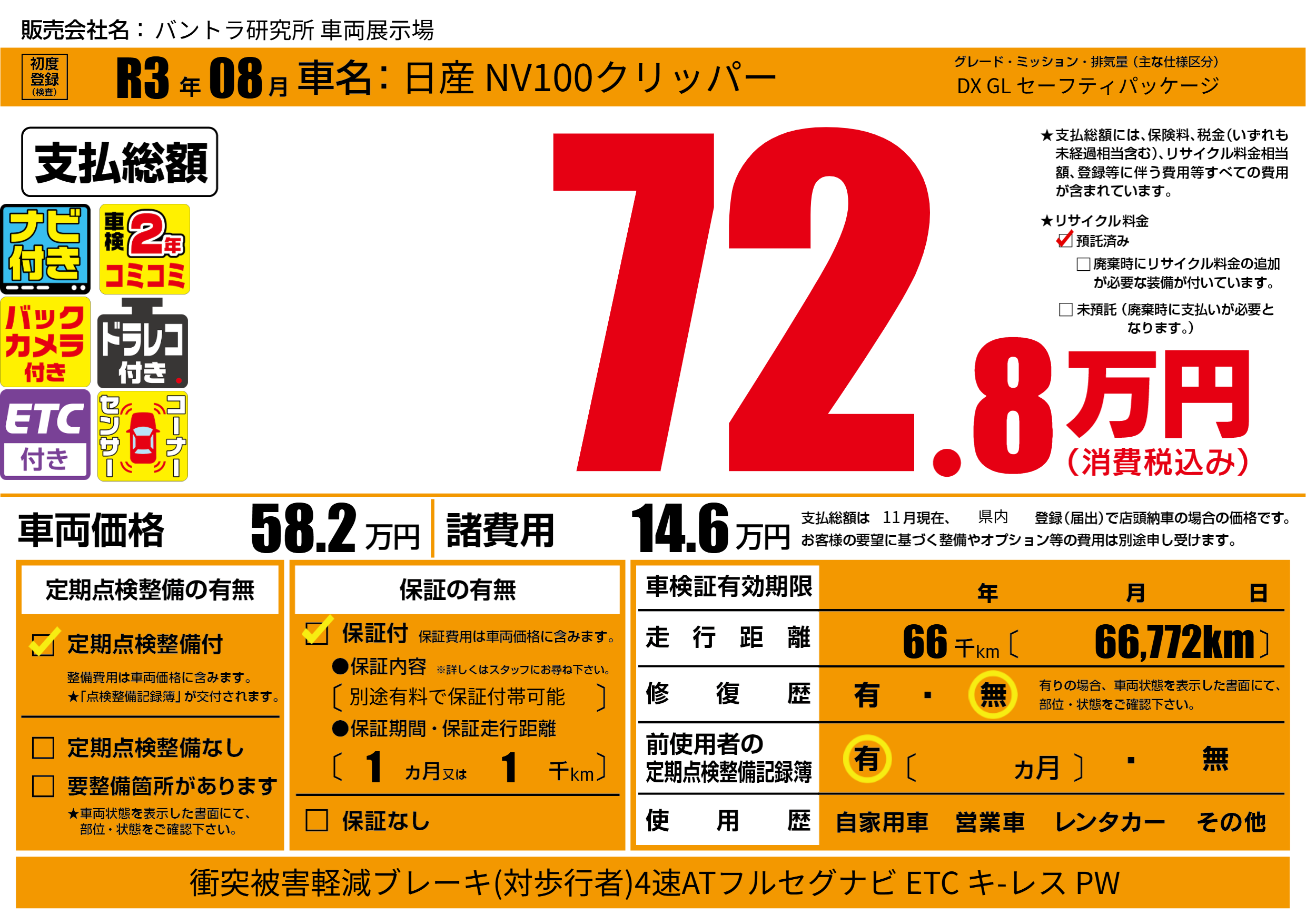 | 車名 | 日産 NV100クリッパー | グレード ミッション 排気量 |