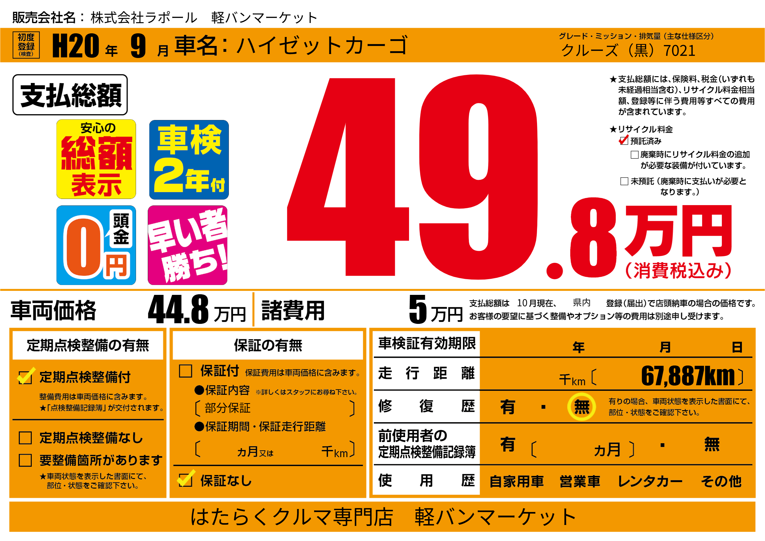 | 車名 | ハイゼットカーゴ | グレード ミッション 排気量 |