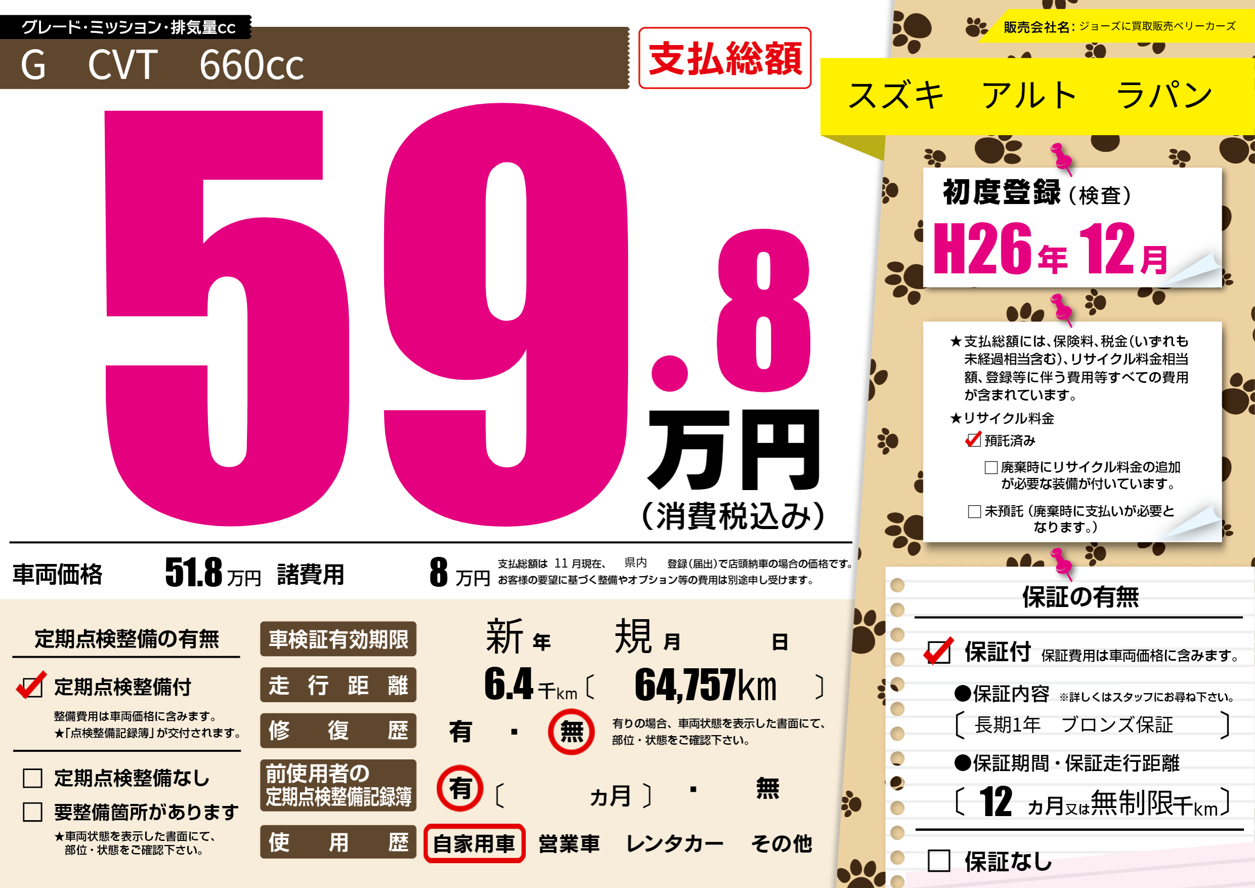 | 車名 | スズキ アルト ラパン | グレード ミッション 排気量 |