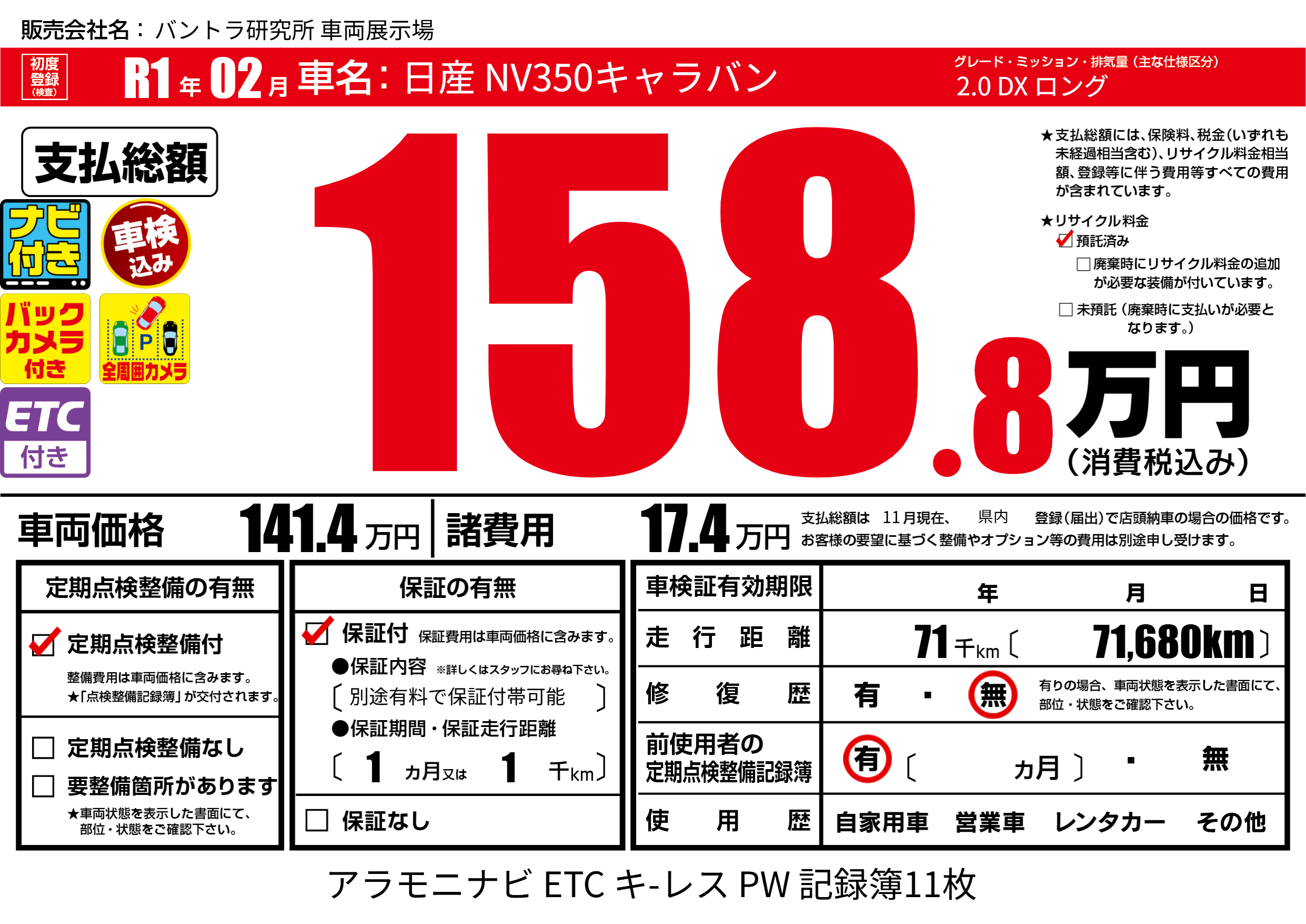| 車名 | 日産 NV350キャラバン | グレード ミッション 排気量 |