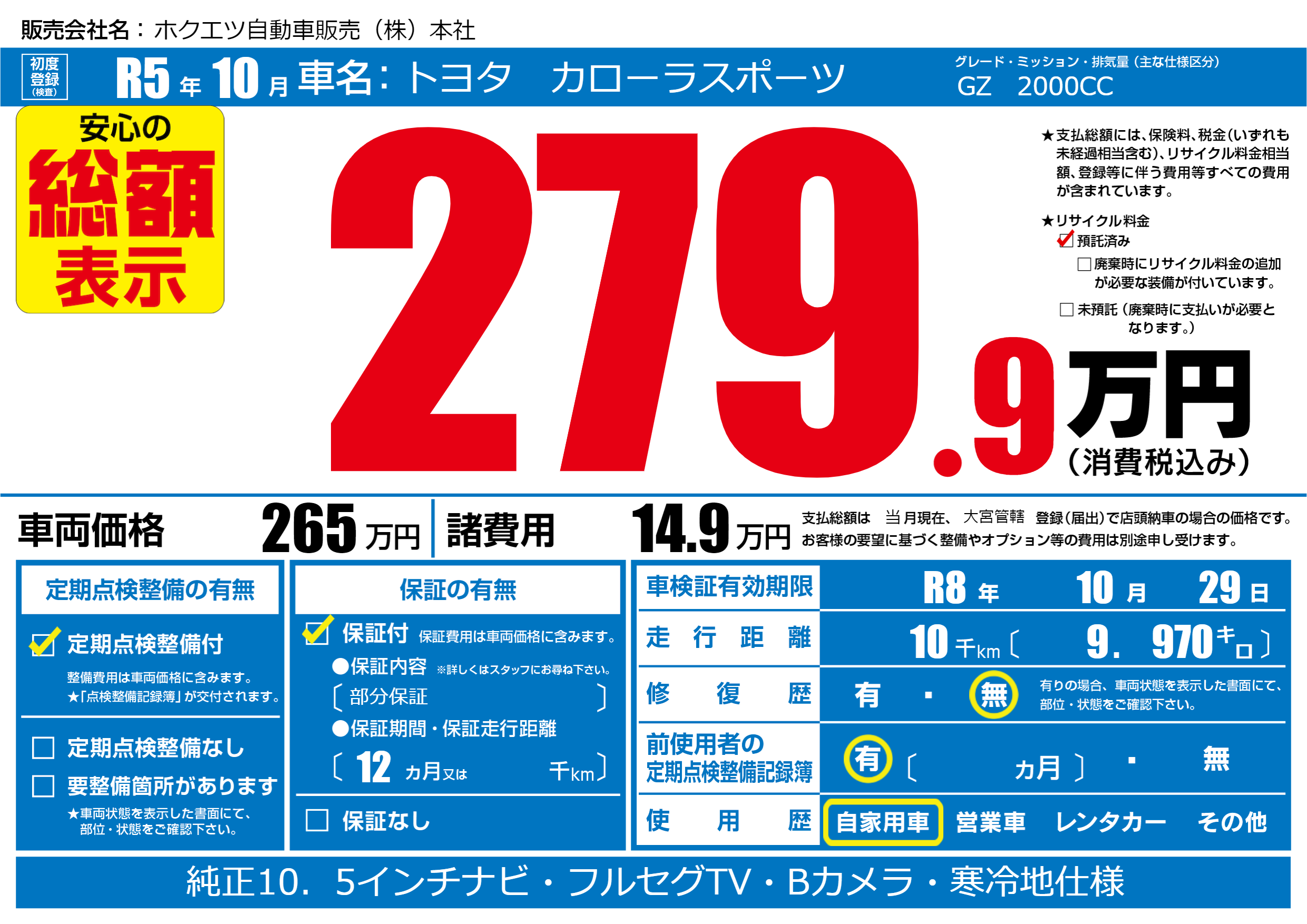 | 車名 | トヨタ カローラスポーツ | グレード ミッション 排気量 |