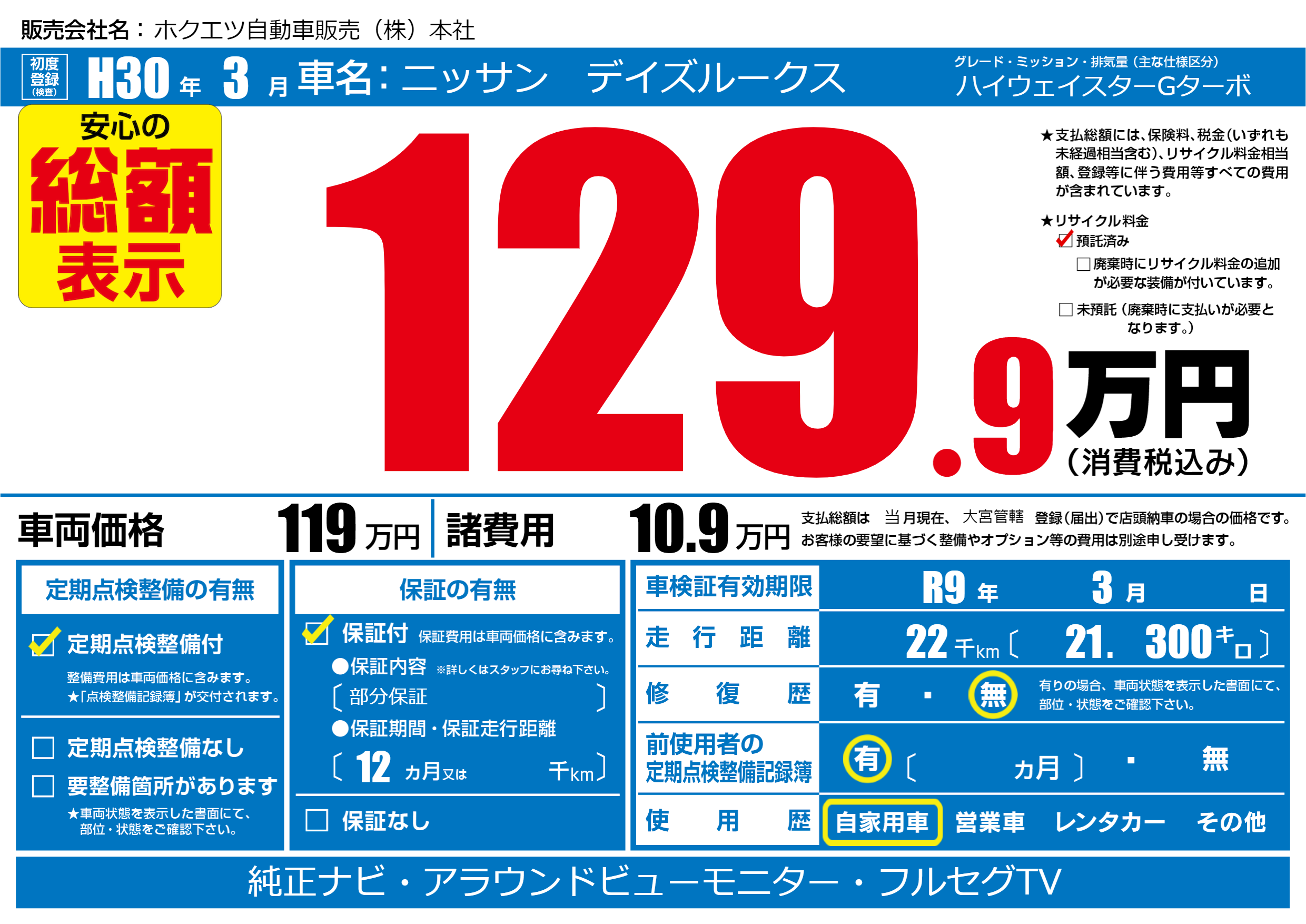 | 車名 | ニッサン デイズルークス | グレード ミッション 排気量 |