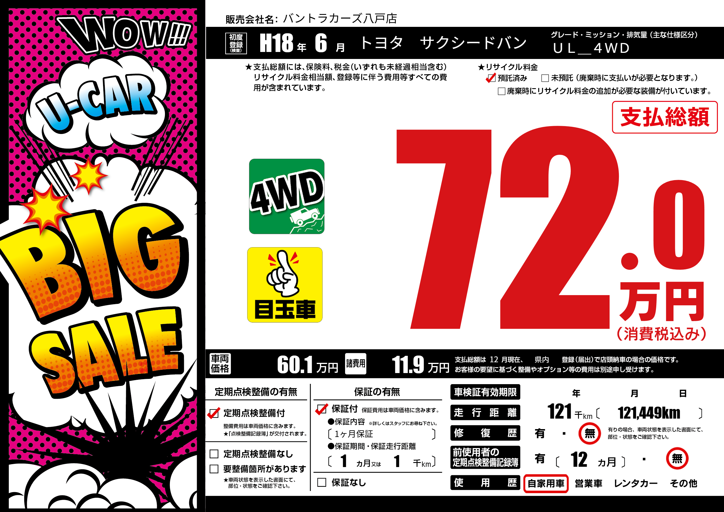 | 走行キロ | 12.1万km | 初年度登録 | H18年6月 |