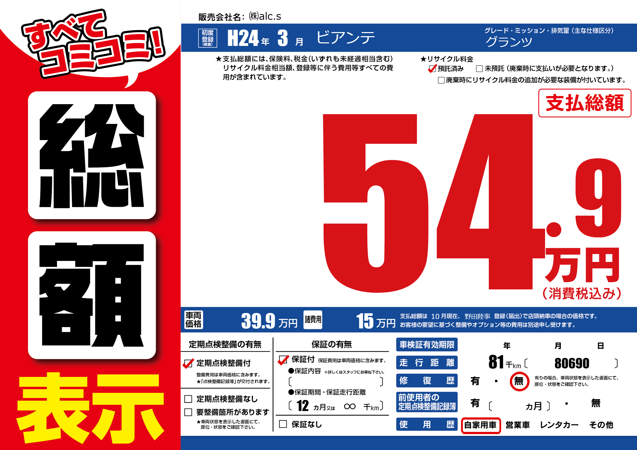 | 車名 | ビアンテ | グレード ミッション 排気量 |