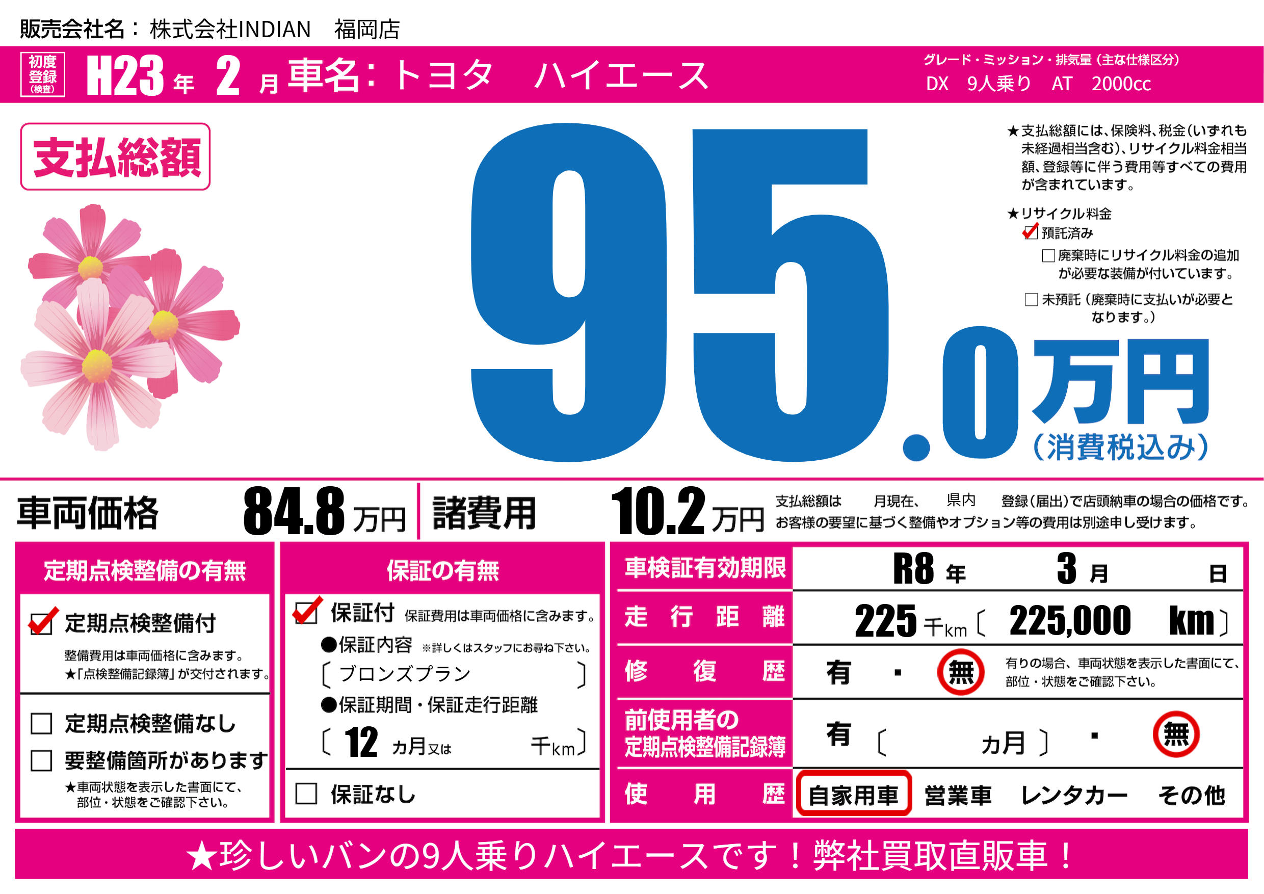 | 走行キロ | 22.5万km | 初年度登録 | H23年2月 |