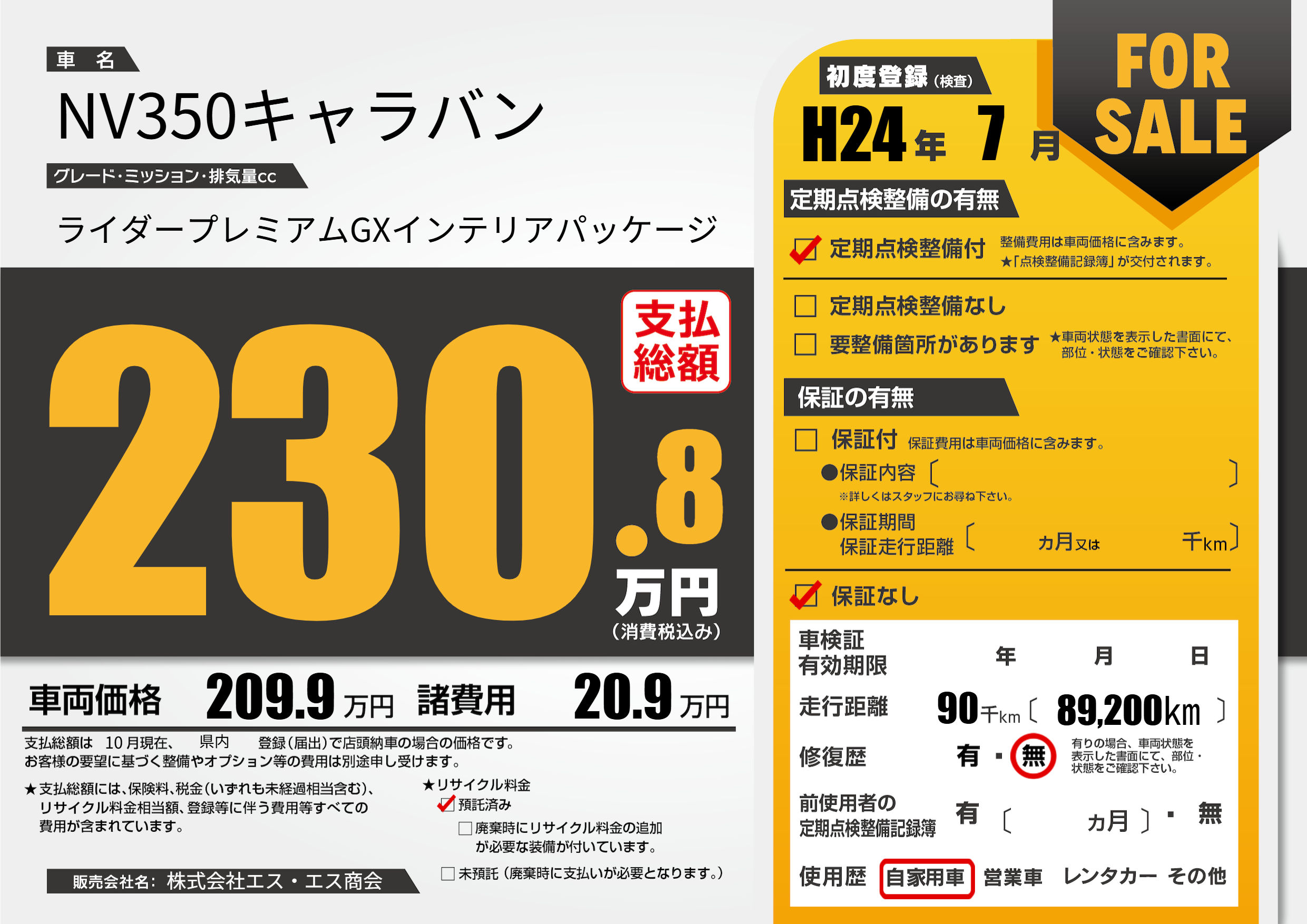 | 車名 | NV350キャラバン | グレード ミッション 排気量 |
