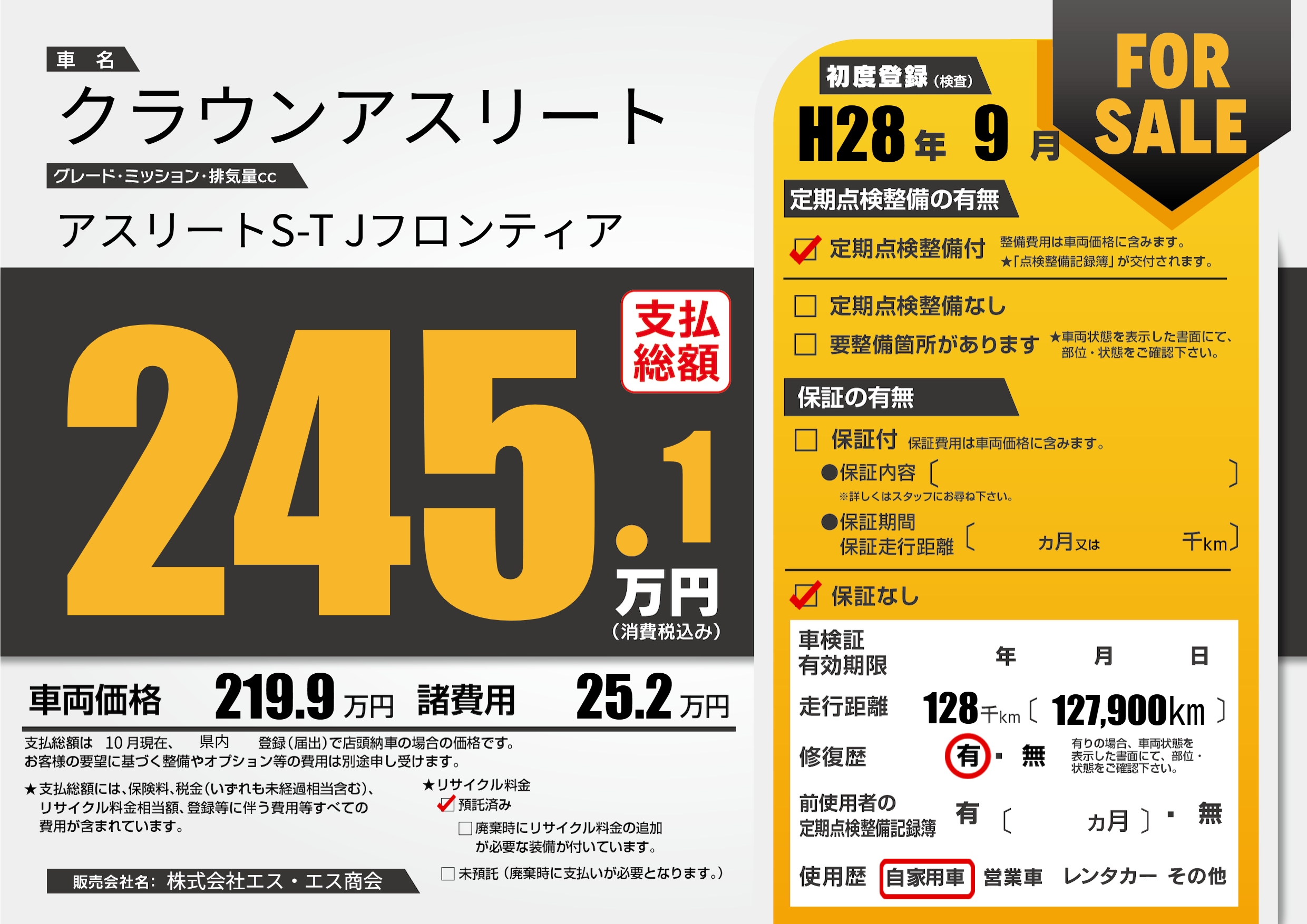 | 走行キロ | 12.8万km | 初年度登録 | H28年9月 |
