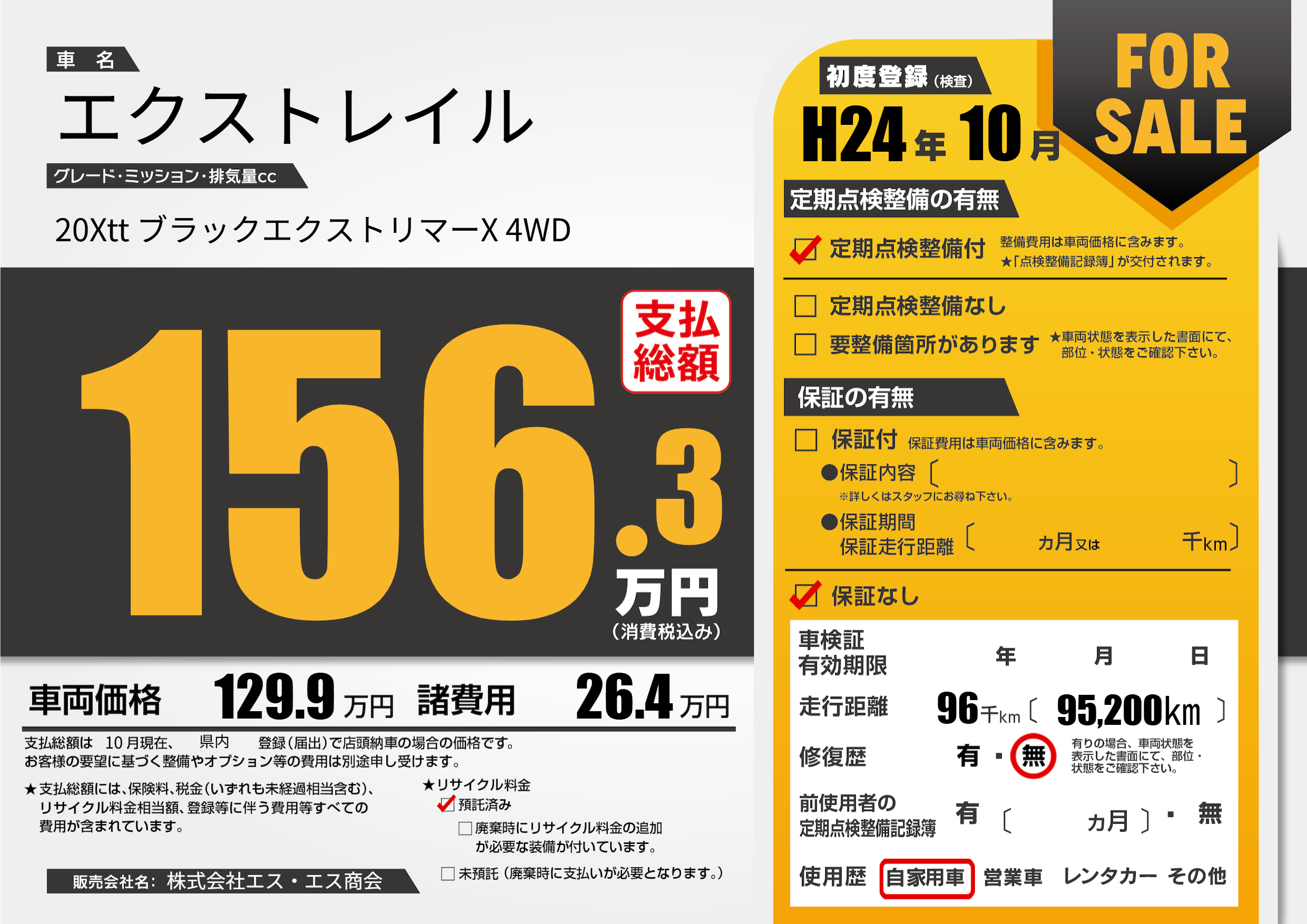 | 走行キロ | 9.6万km | 初年度登録 | H24年10月 |