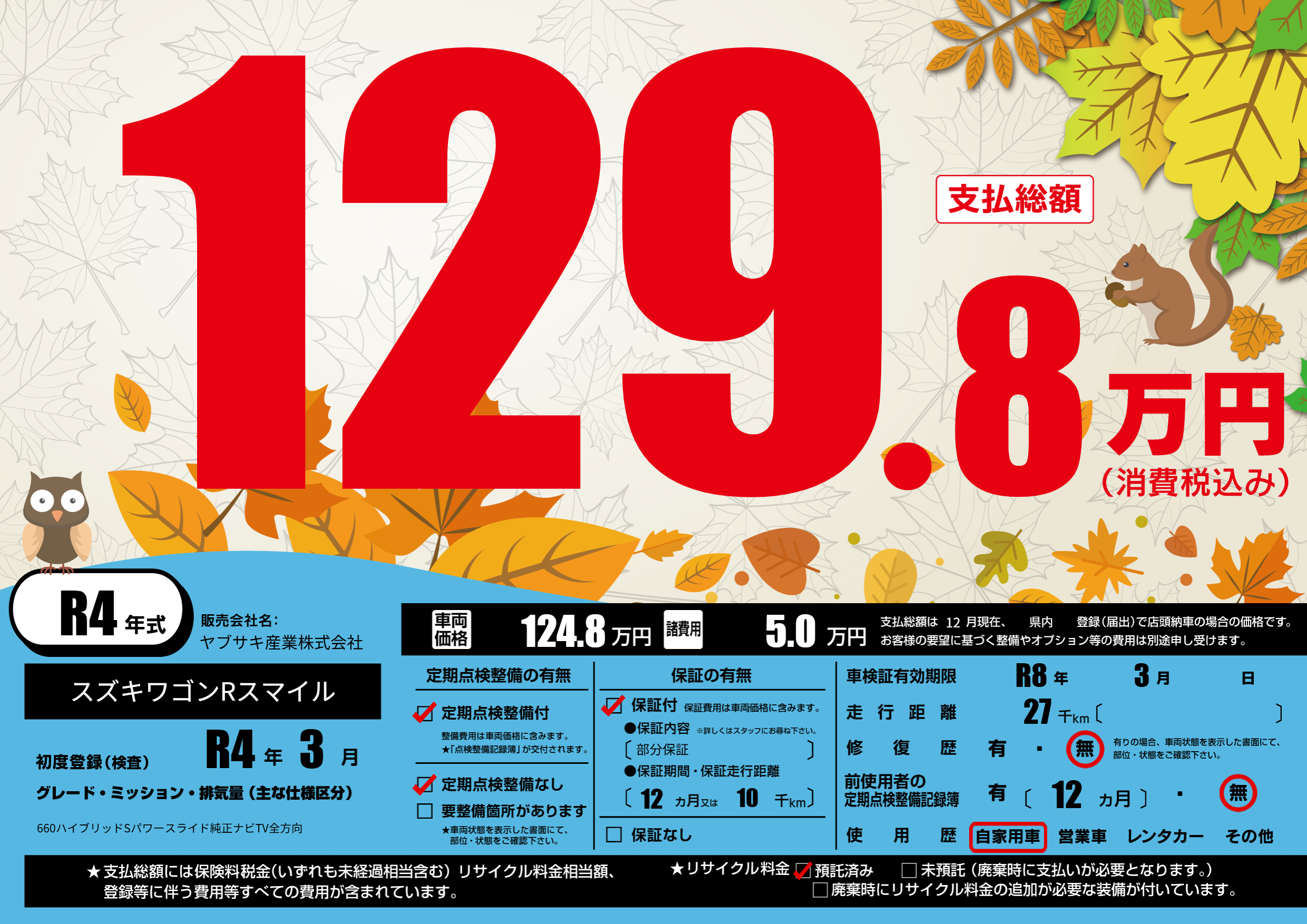 | 車名 | スズキワゴンRスマイル | グレード ミッション 排気量 |