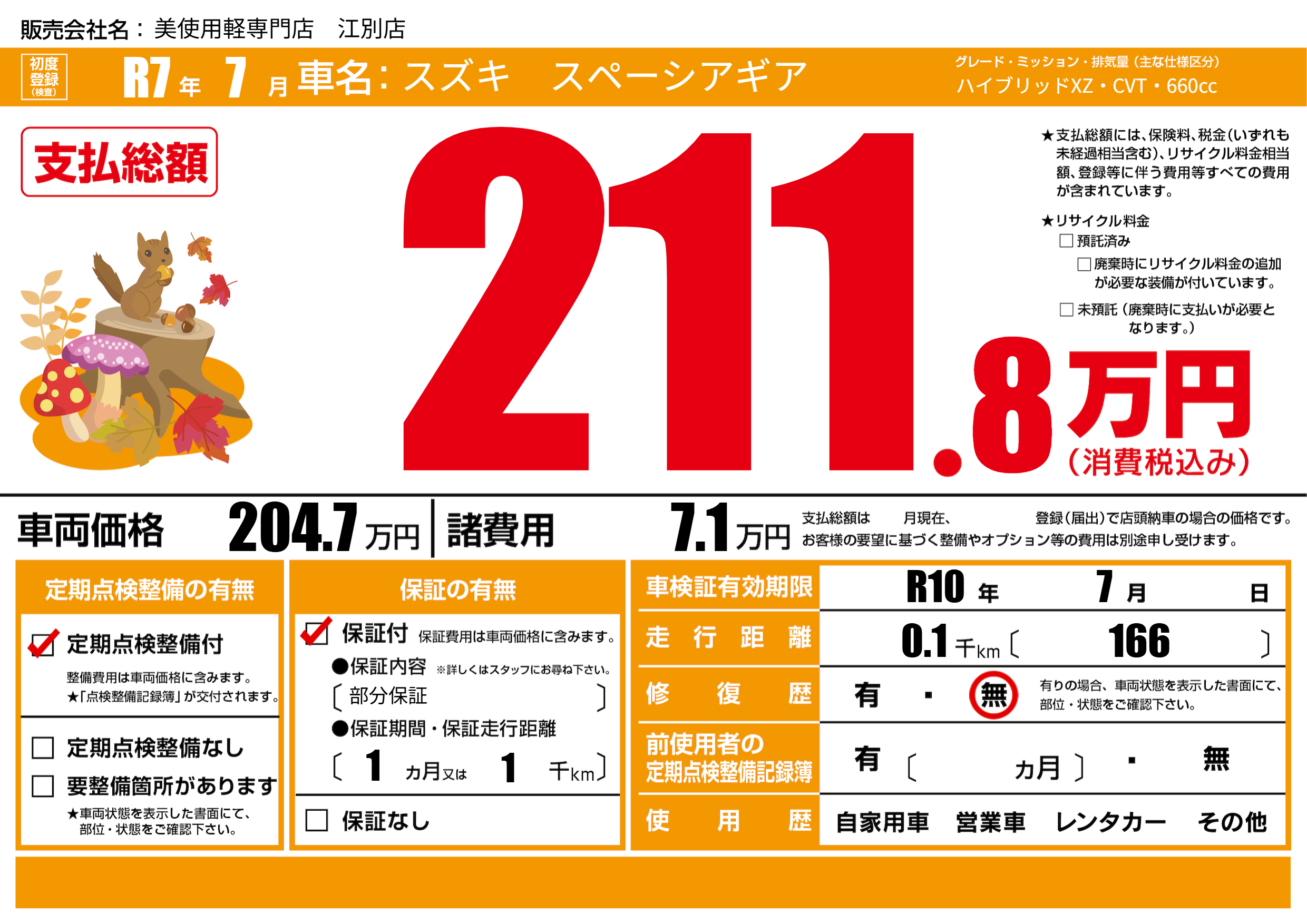 | 車検制限 | R10年 7月 - 日 | ||