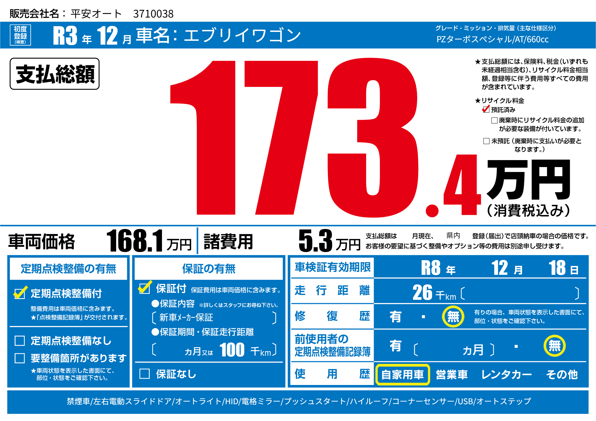 | 車名 | エブリイワゴン | グレード ミッション 排気量 |