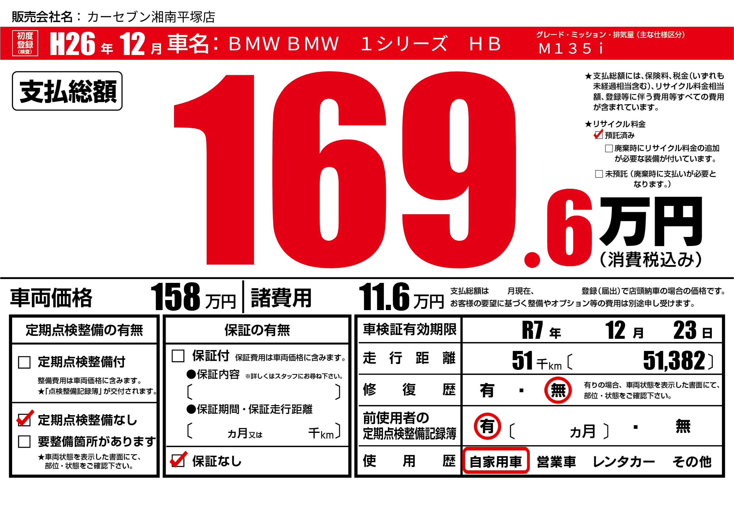 | 走行キロ | 5.1万km | 初年度登録 | H26年12月 |