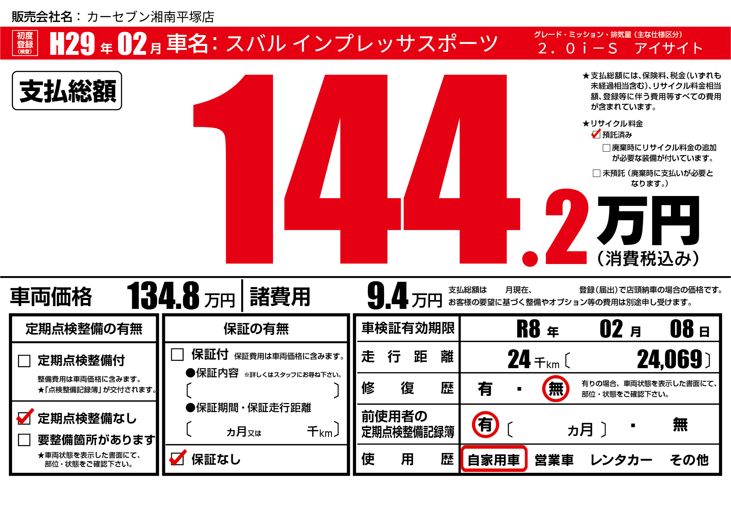 | 車名 | スバル インプレッサスポーツ | グレード ミッション 排気量 |