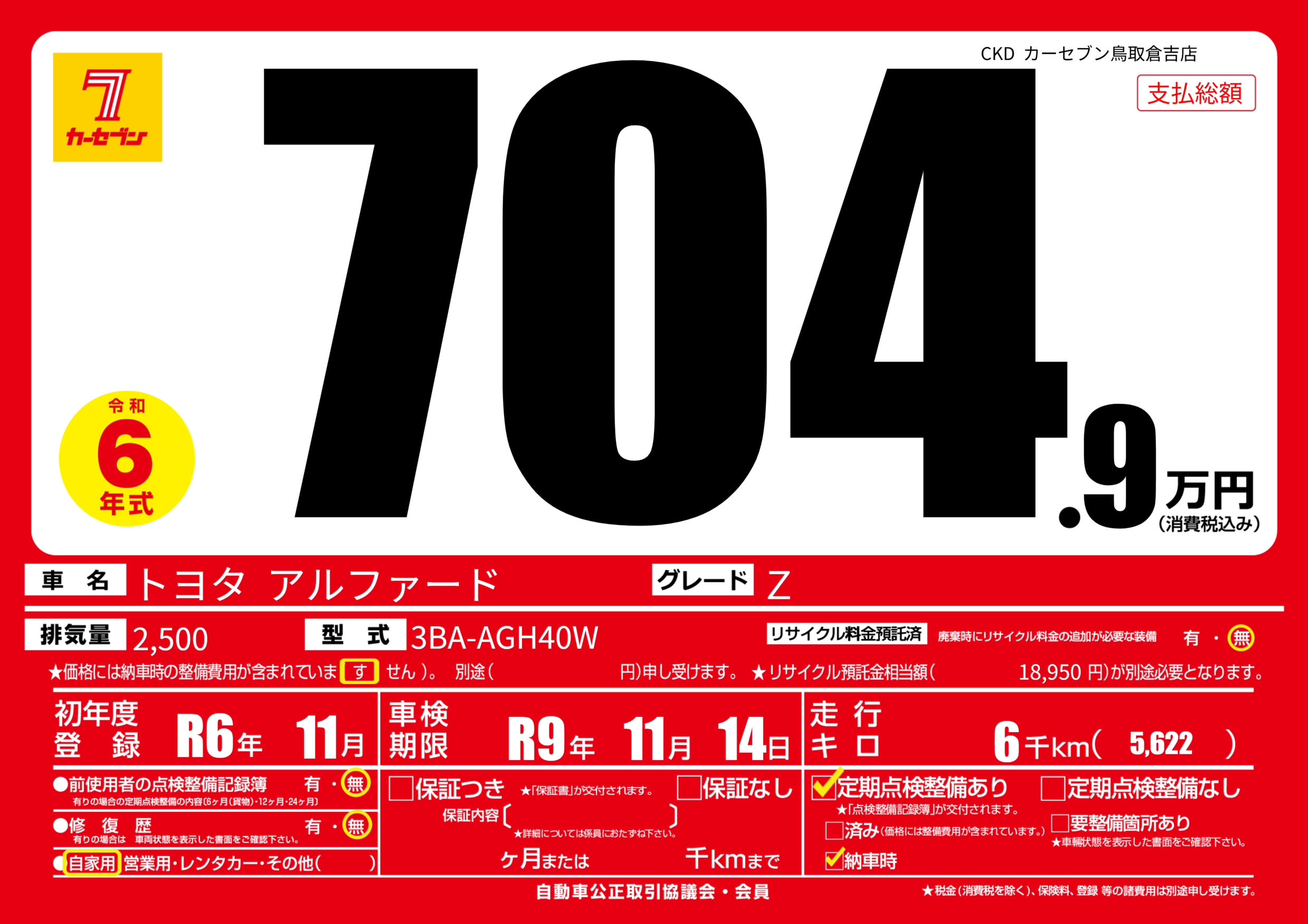 | 走行キロ | 0.6万km | 初年度登録 | R6年11月 |