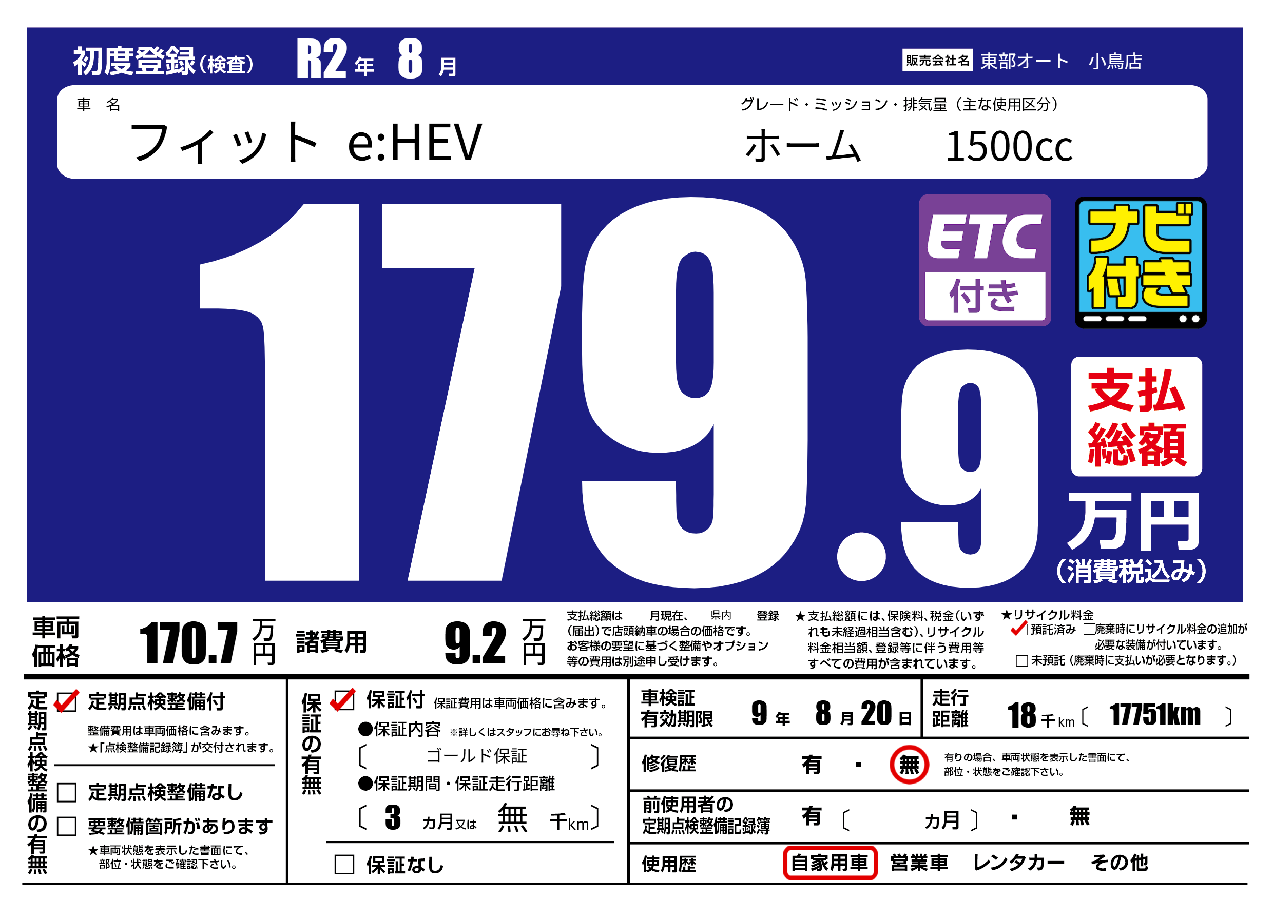 | 車名 | フィット e:HEV | グレード ミッション 排気量 |