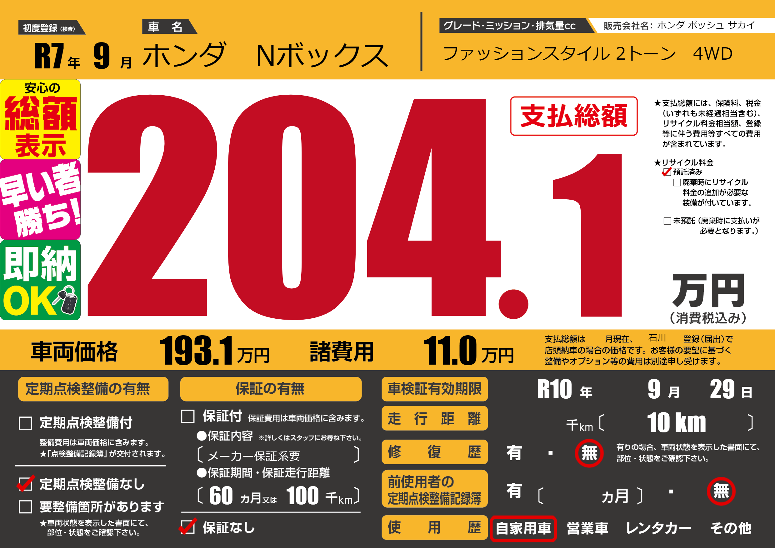 | 走行キロ | - | 初年度登録 | R7年9月 |