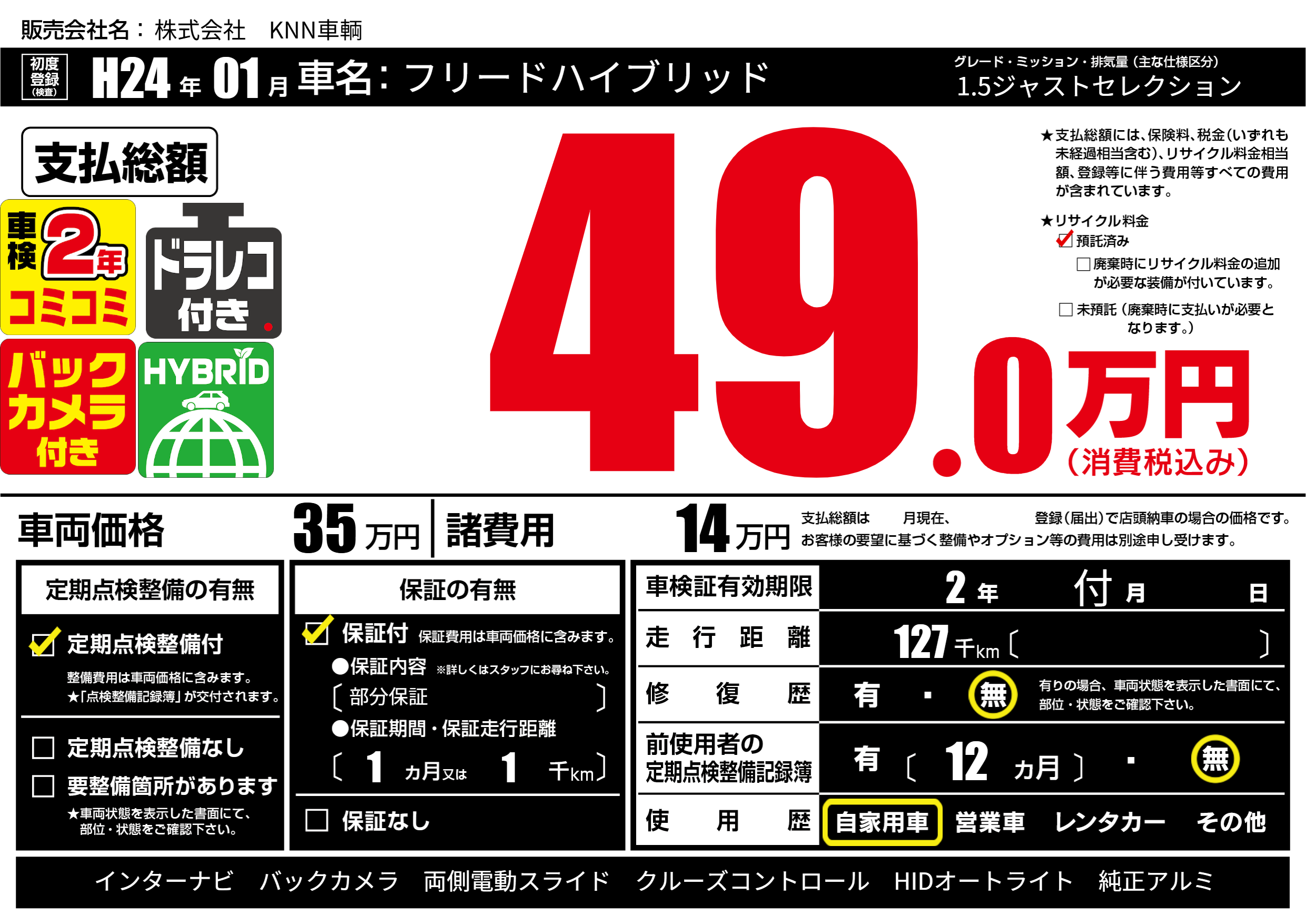 | 走行キロ | 12.7万km | 初年度登録 | H24年01月 |