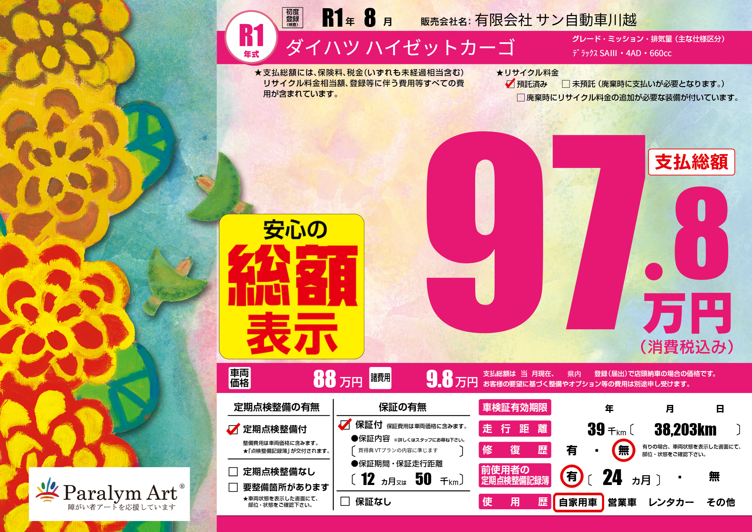| 車名 | ダイハツ ハイゼットカーゴ | グレード ミッション 排気量 |