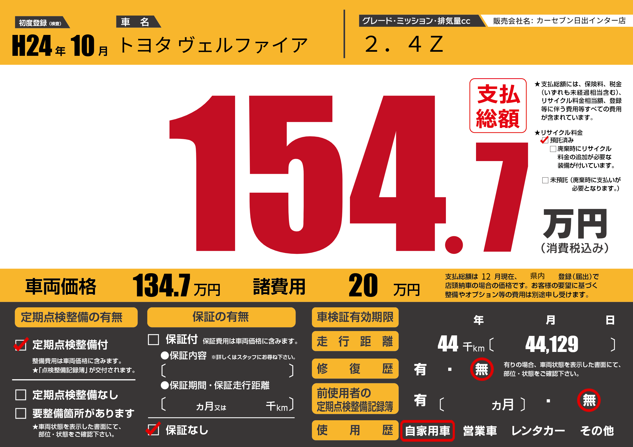| 走行キロ | 4.4万km | 初年度登録 | H24年10月 |