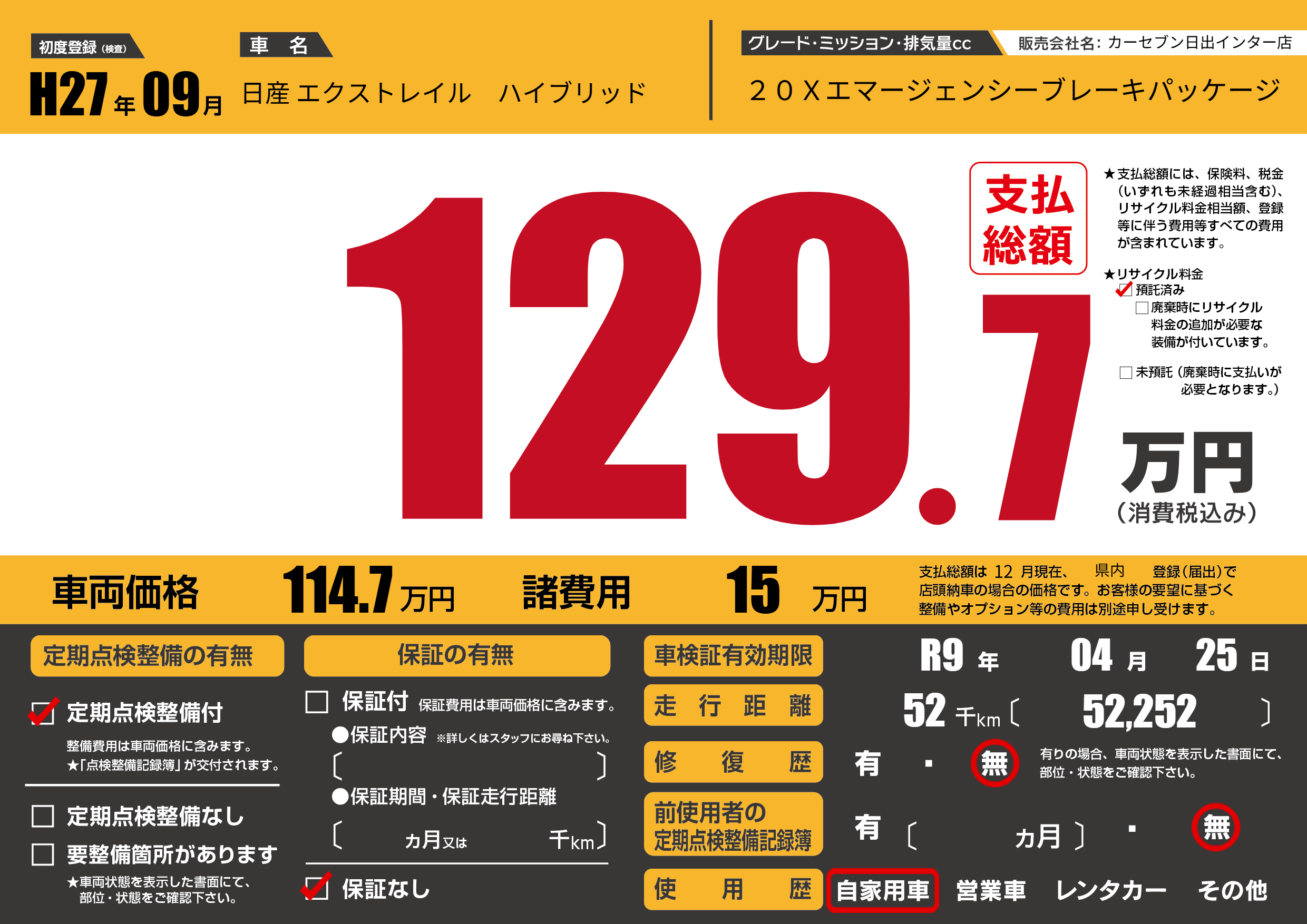 | 車名 | 日産 エクストレイル ハイブリッド | グレード ミッション 排気量 |