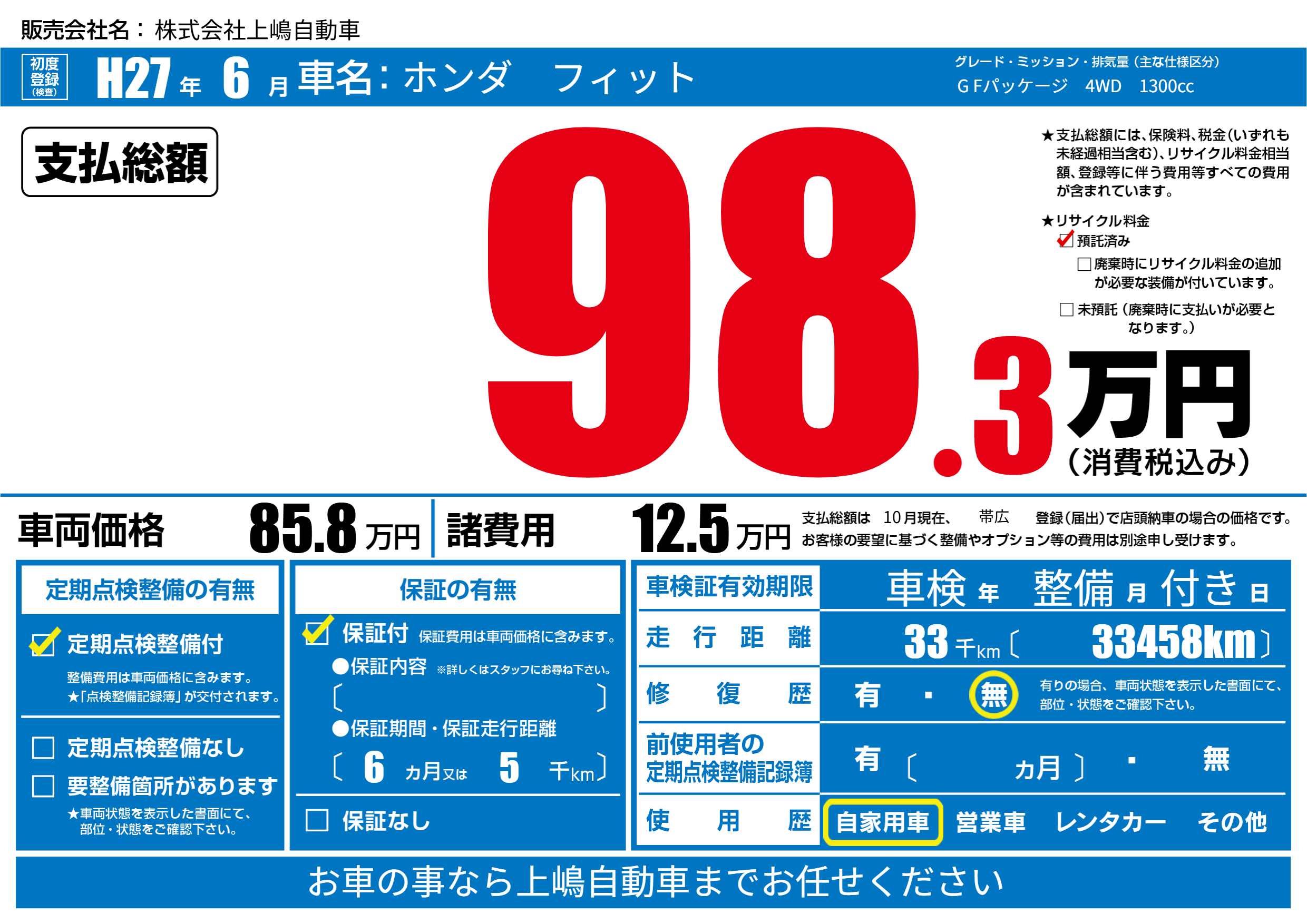 | 車名 | ホンダ フィット | グレード ミッション 排気量 |