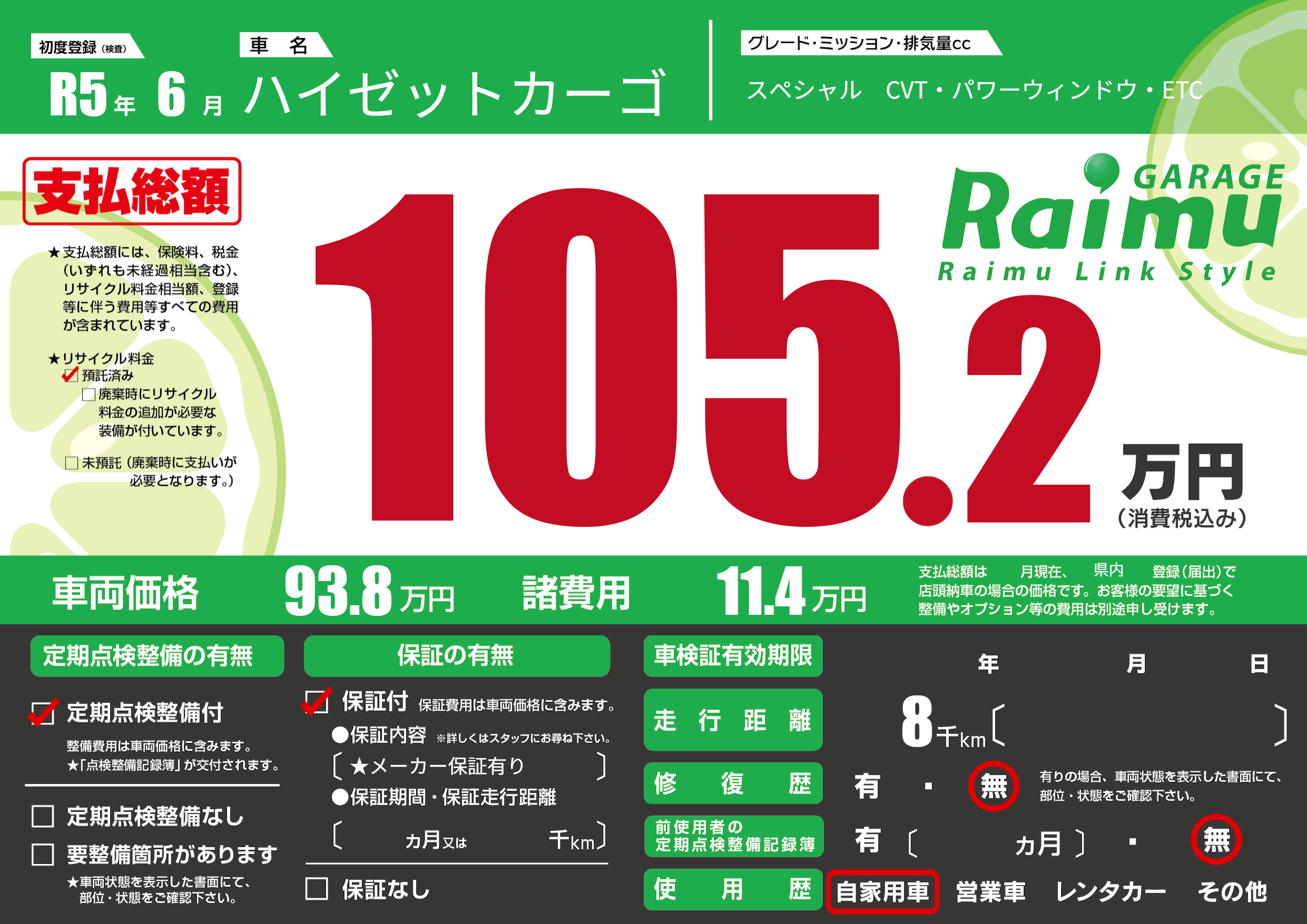 | 走行キロ | 0.8万km | 初年度登録 | R5年6月 |
