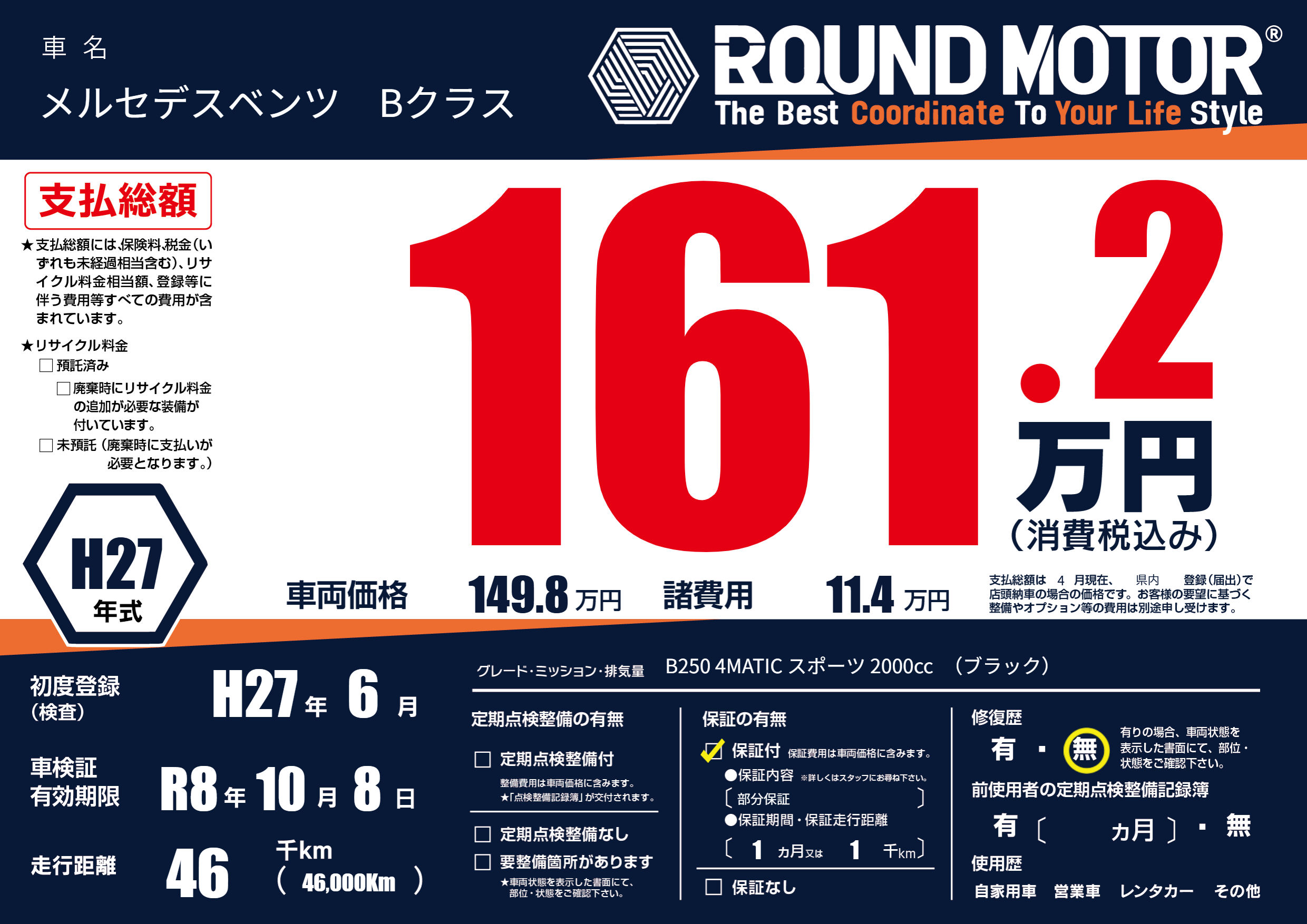 | 車名 | メルセデスベンツ Bクラス | グレード ミッション 排気量 |