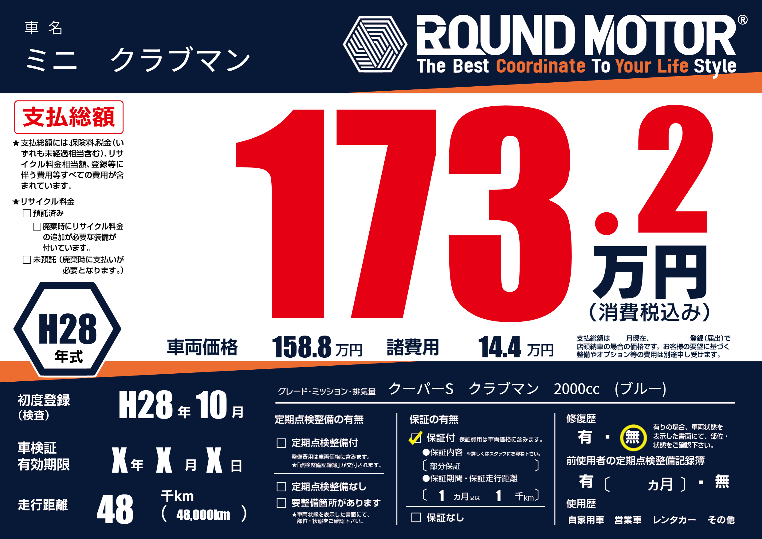 | 車名 | ミニ クラブマン | グレード ミッション 排気量 |