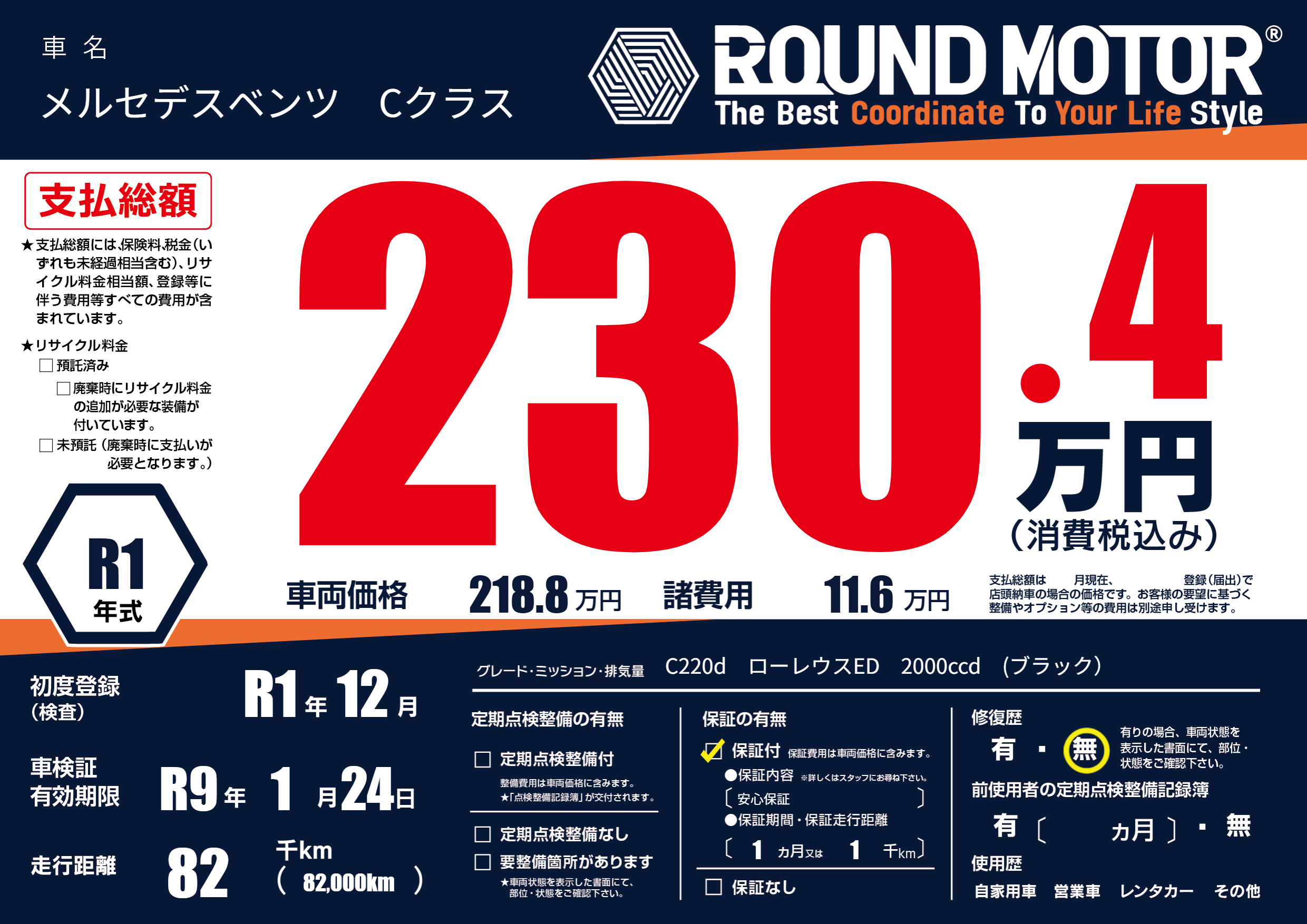 | 車名 | メルセデスベンツ Cクラス | グレード ミッション 排気量 |