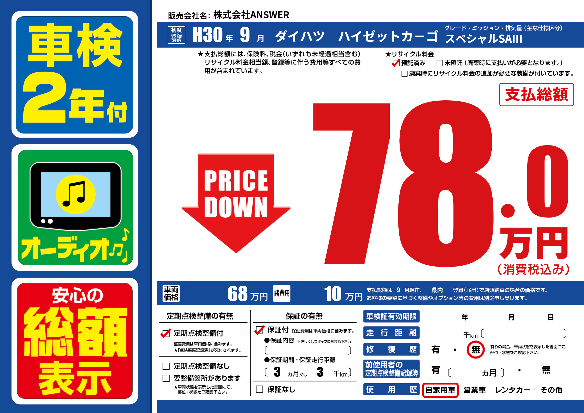 保証付き 保証内容(---) 3ヶ月または(3)千kmまで |